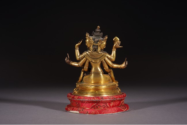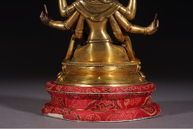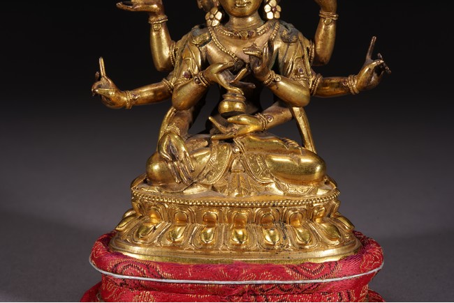 尊勝佛母,又稱“頂髻尊勝佛母”。佛母在兜率天說法時,以“陀羅尼”經 咒救度王子,因此尊勝佛母有救度之功。尊勝佛母的巨大影響力體現在兩方面: 一是它的陀羅尼經咒廣泛流傳,被認爲具有防災的功能,所以在寺廟或寺院前的 經幢頂上所刻幾乎均是此尊的咒語,在皇家陵墓地宮、貴族死者的經被上也採用 此咒;另外,她也被看作是壽神,與無量壽佛和白度母共同組成“長壽三尊”的 著名組合廣爲人知。佛母三面八臂,每面三目,微露笑意,結跏趺安坐。面容慈祥,頭戴寶冠, 耳下墜耳鐺,八臂位置、手勢各異,左上方手托阿彌陀佛,胸前手捧甘露壽瓶, 肢體描繪富於動感,優雅寫實。身形健美,腰肢纖細,具有女性的獨特撫媚。項 圈、瓔珞、手鐲、臂釧、腰帶等飾物一應俱全,製作極爲精細。上身袒露,下著 薄裙,衣紋流暢自然,充滿輕柔質感。蓮瓣寬扁,蓮尖卷翹,藝術性極高。整尊造像鎏金濃鬱,用材考究,工藝精湛,造型比例精準,並保留了原封底,愈顯珍 貴。