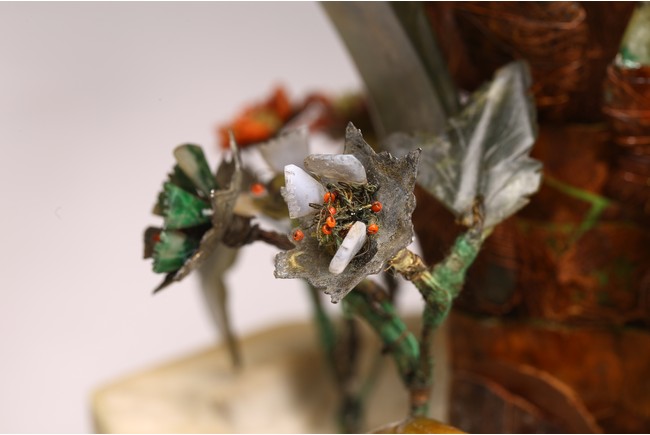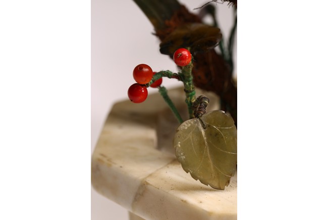 Qing Dynasty period. Each modelled in the form of an octagonal jardiniere carved from marble supported on ruyi shaped feet, elaborately decorated with orchids formed from spinach green jade, amber beads, and corals.