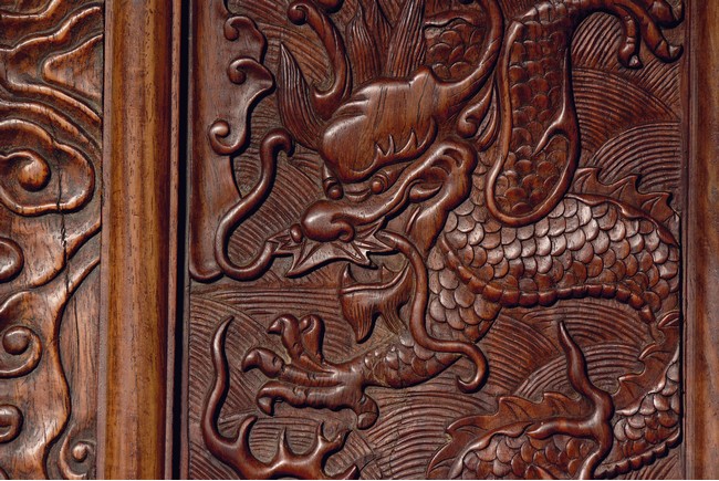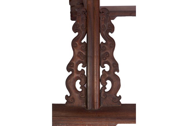 The chair with u-shaped crest rail and back spalt finely decorated with five-clawed dragon emerging from crashing waves and ruyi-shaped clouds to the sides, arms terminated with mythical beast mask, with threaded seat, the stretcher with archaistic dragon design. Republic period or Late Qing.