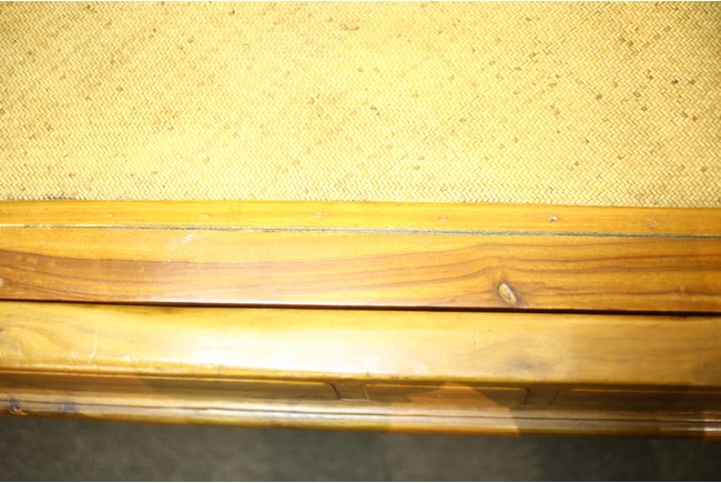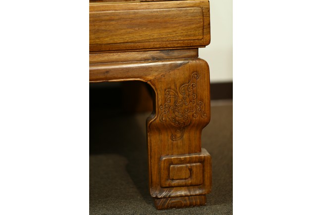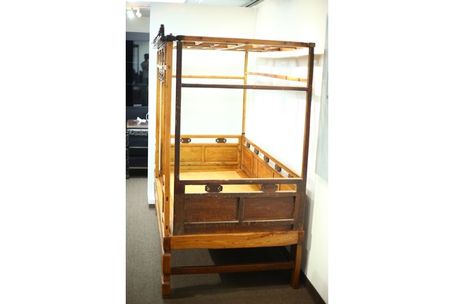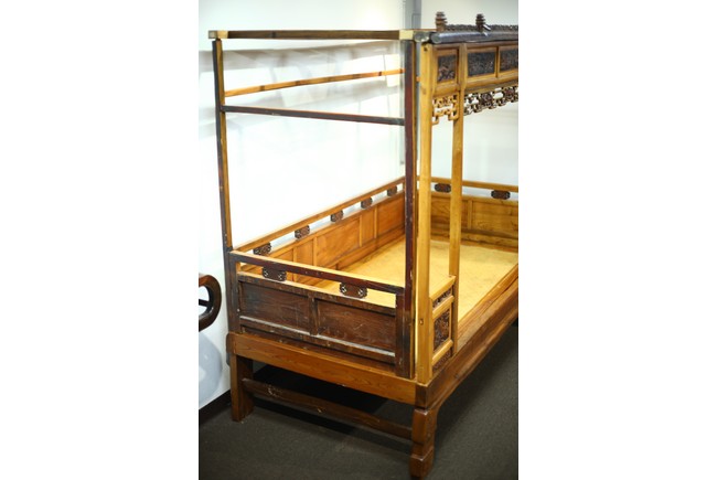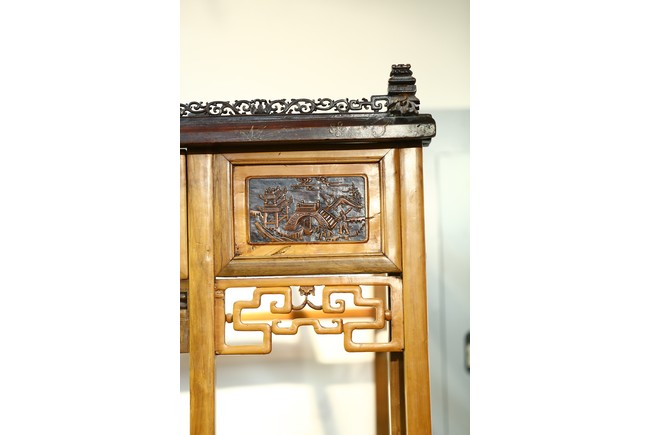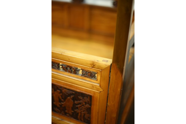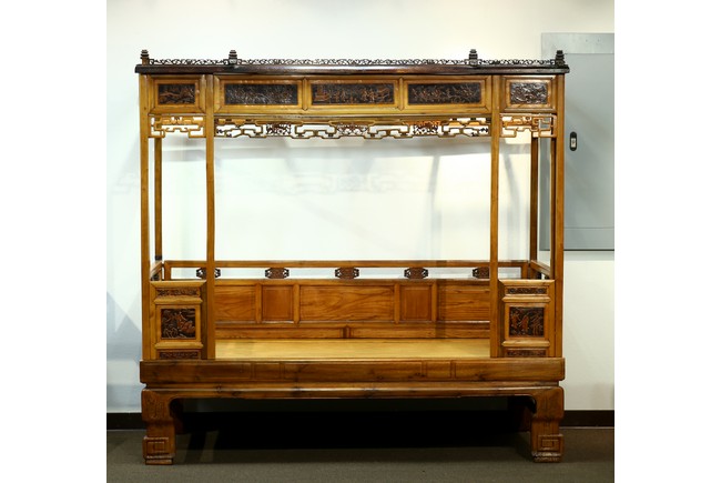 Chinese. Supported on four thick scrolled feet carved with chilong in relief, the front railing carved in relief with story scene of figures in landscape setting, the canopy supported on six posts with four at the corners and two set in at the front, all below a canopy with three five solid front panels carved with flower and landscape scenes. Qing Dynasty period.