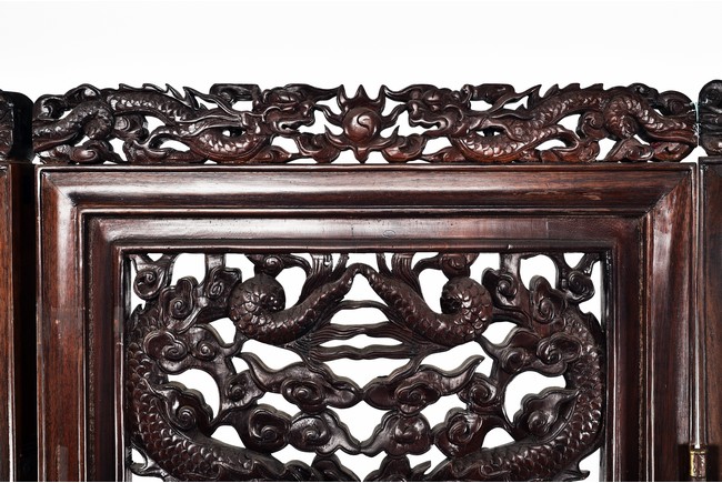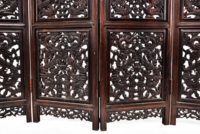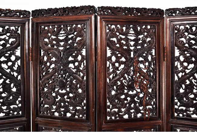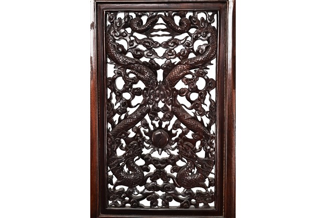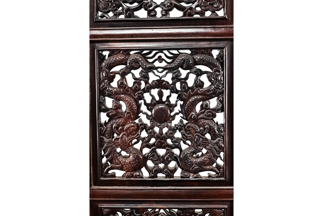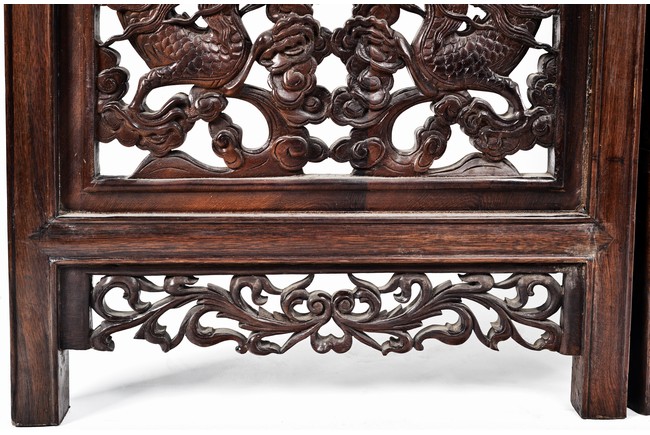 Chinese. Consisting of four rectangular openwork panels, each reticulated to depict pair of dragons flanking flaming pearl. Republic period.