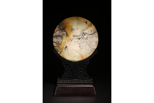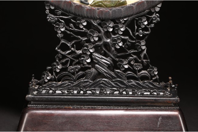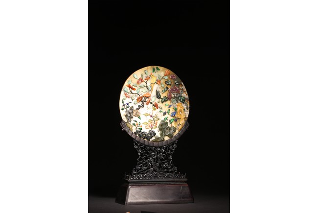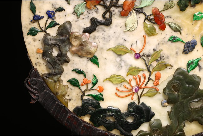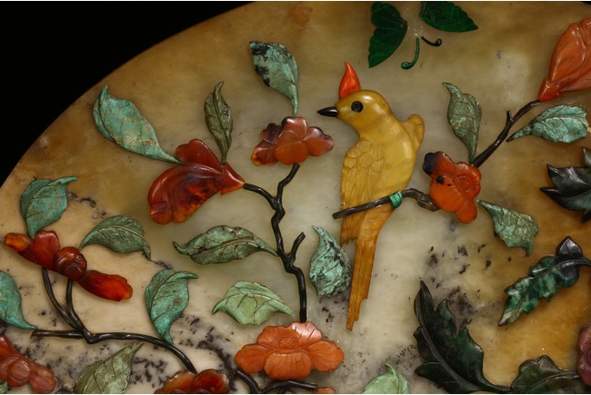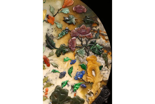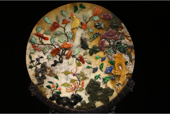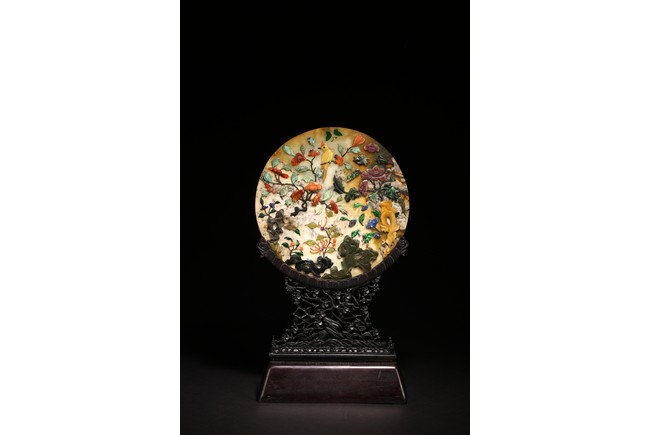 百寶嵌工藝出現於明代,它是在螺鈿鑲嵌工藝的基礎上,加入寶石、象牙、珊瑚以及玉石等材料形成的鑲嵌工藝,用百寶嵌成的圖案花紋會隨著照射光線角度的變化,發出各種各樣的光彩,主要出現在中國古典家具以及工藝美術品上。進入清代以後,百寶嵌發展成為清宮造辦處製作的重要鑲嵌技術之一。本品用材考究,製作複雜,設計端莊典雅,佈局疏密相間,色彩鮮明,巧妙利用松石、蜜蠟、瑪瑙、珊瑚、碧玉、青金石等材質描繪“花鳥”“樹木”“花朵”“山石”。造型規矩,端莊大方,穩重典雅,工藝極其複雜。帶有鏤雕花卉紋木座。