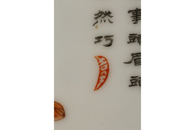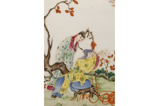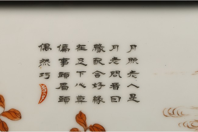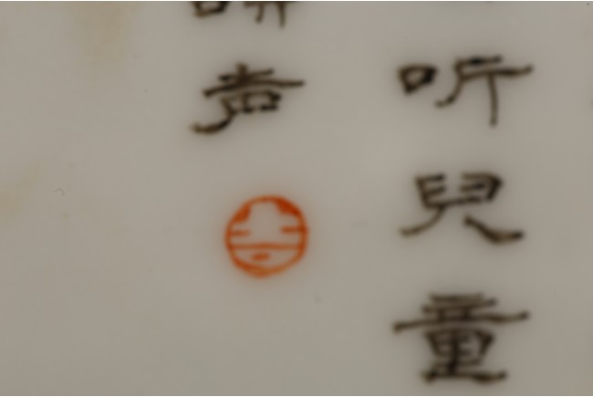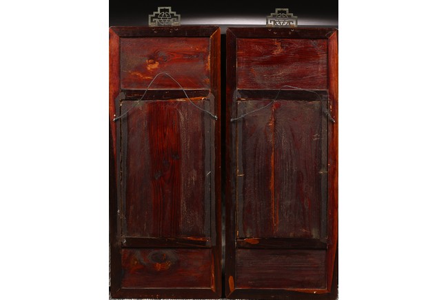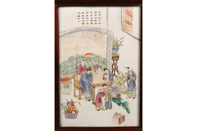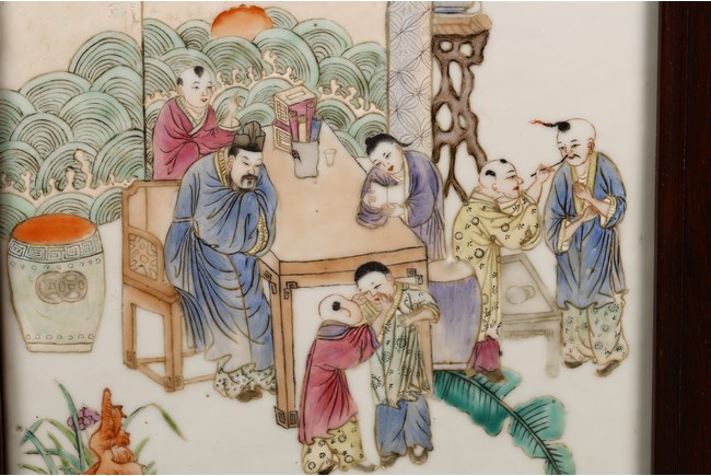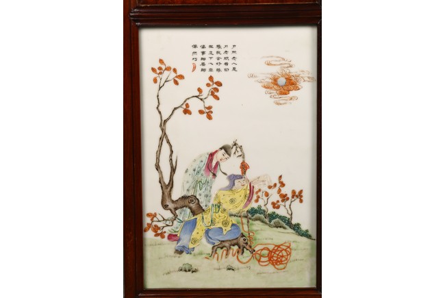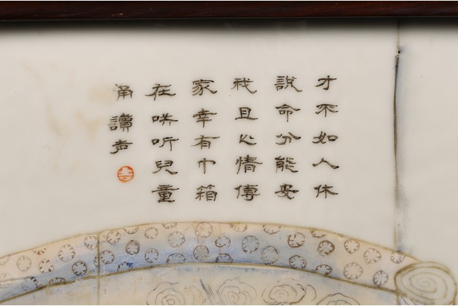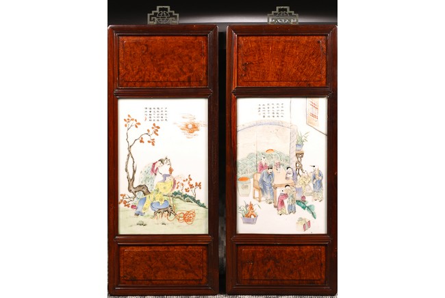 瓷板嵌於紅木框中,紅木木色鮮亮,紋理自然。瓷板施粉彩繪“人物”“桌椅”“蘭草”“卷雲”,色彩艷麗,人物描繪細緻,神情各異。墨彩書詩文“才不如人休說命分能安我且心情傳家幸有巾箱在哄聽兒童湧讀聲”。成對保存完好。