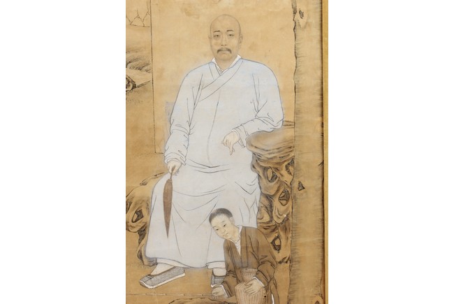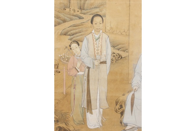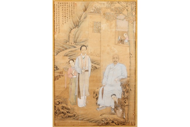 Ink and color on paper. Portrait of a family. Framed. Inscribed and signed Huang Huaiqing with two seal marks.