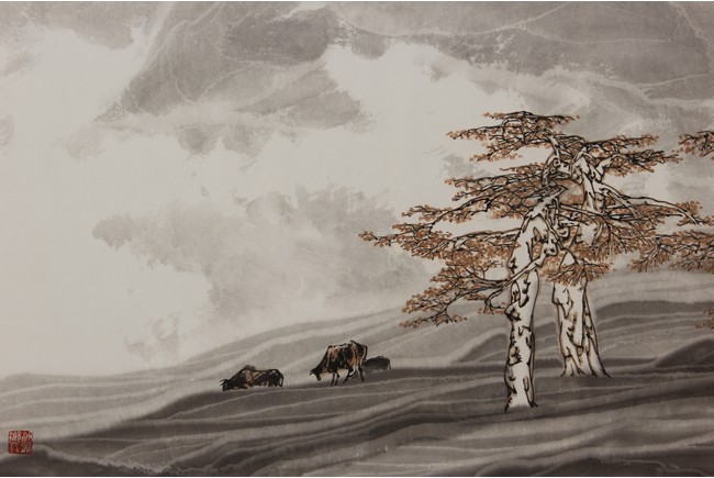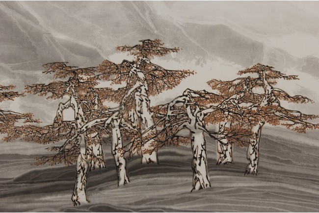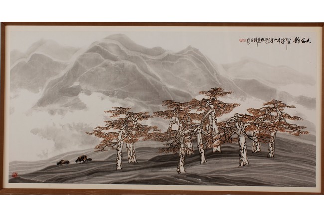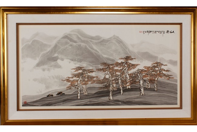 Framed. Autumn Color and ink on paper. With inscription, signed, and three seals of the artist.