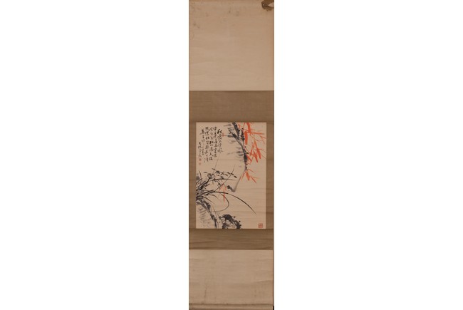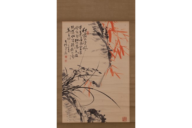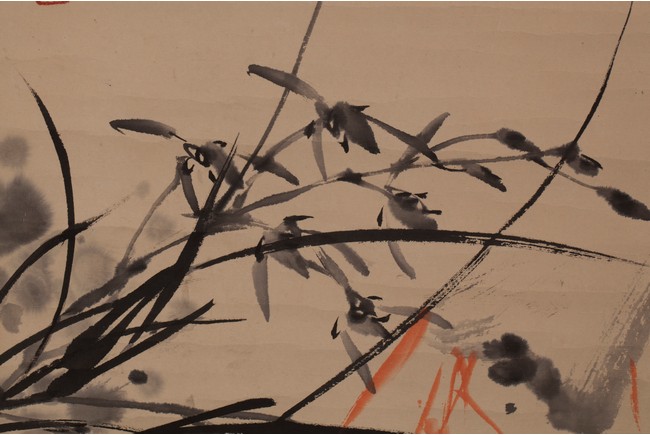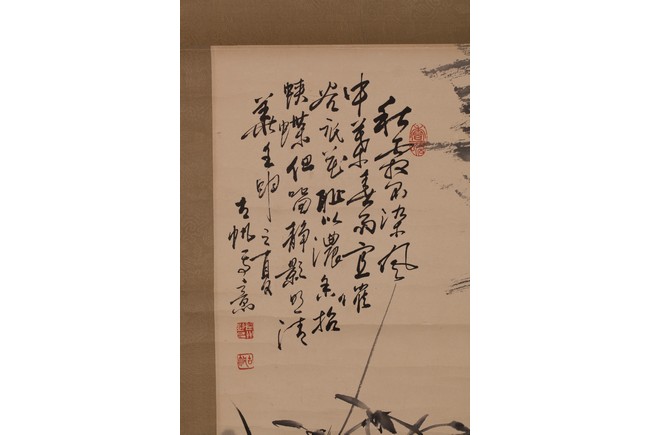 The ink painting depicts elegantly drawn bamboo leaves, bamboo sticks, and patches of grass on the side. Artist signature and marks 'Gu Fan' on the top left corner.