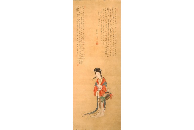 Color and ink on silk. Lady. Hanging scroll. Inscribed and signed, with one seal of the artist.