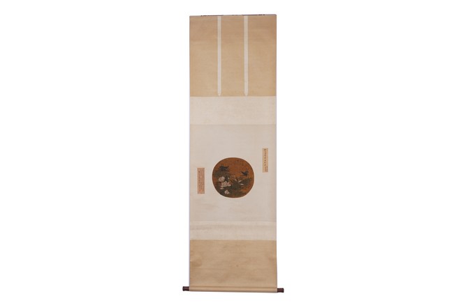 Ink and Color on Silk. Hanging scroll. Butterflies and Flowers. Inscribed and signed Lu Zhi with two seal marks, with one colophons and one title slip inscriptions both signed and with seal mark.