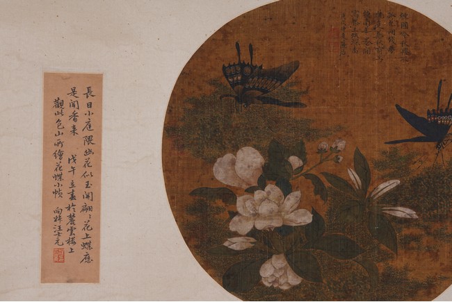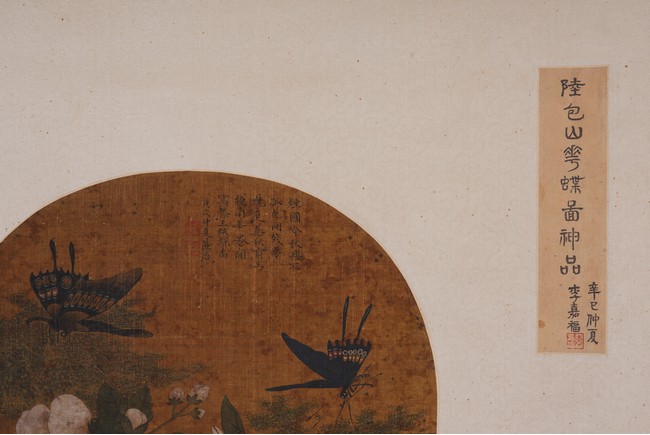 落款:庚戌仲夏陸治 題跋:陸包山花蝶畫神品 辛已仲夏 李嘉福 向叔汪 士元(陸治:明代畫家,字叔平工寫生得徐、黃遺意。點染花鳥竹石,往往天 造。;汪士元江蘇省盱眙縣人,原名汪祜孫,字向叔,齋號麓雲樓,因其藏有 宋徽宗畫《晴麓橫雲圖》立軸而得名;又號玉帶硯齋、清淨瑜迦館。爲近代著 名收藏家、書畫家、政治家,著有《麓雲樓書畫記略》。;李嘉福:字麓蘋, 號笙魚,一號北溪,自署石佛庵主、語溪老民,浙江石門(今崇德)人,流寓 吳縣。爲精鑒賞,收藏極富,銳志學畫