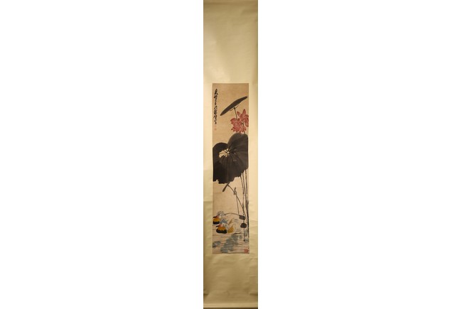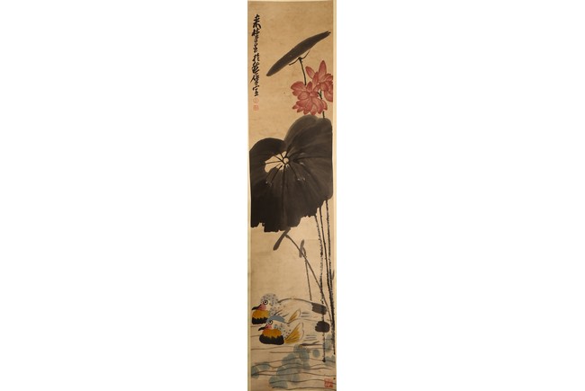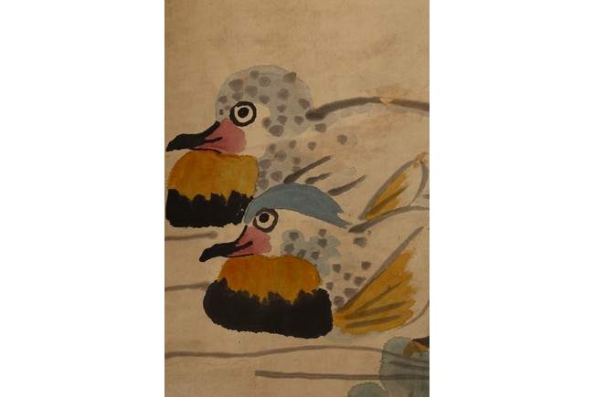 Color and ink on paper. Mandarin ducks. Hanging scroll. Inscribed and signed with three seal marks of the artist.