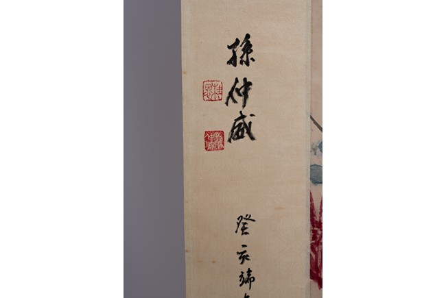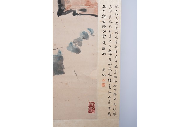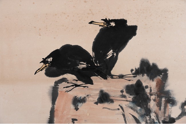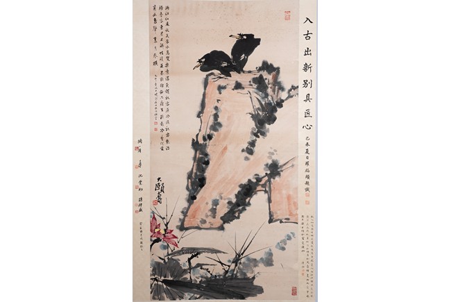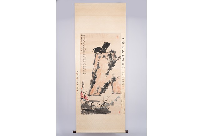 Chinese. Color and ink on paper. Two birds on rock. Hanging scroll. Signed Da Yishou, with three seal marks of the artist, and with further inscriptions and annotations by various collectors.