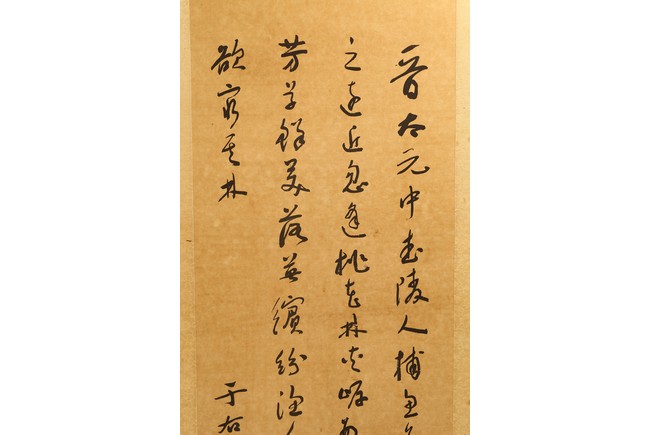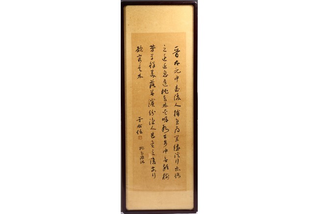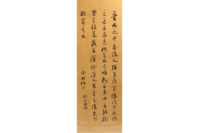 Color and ink on paper. Running script calligraphy. Framed. Signed Yu Youren.