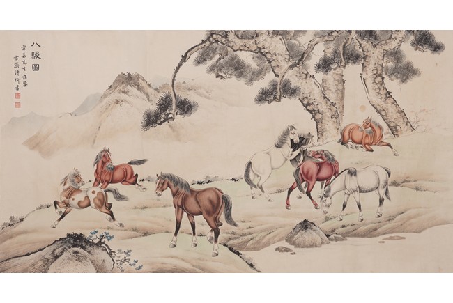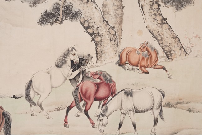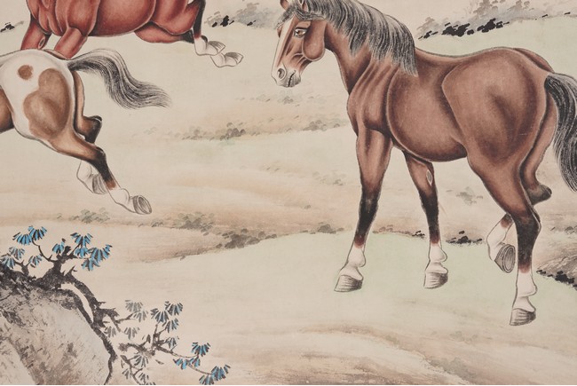 Color and ink on paper. Horses. Mounted on paper. Inscribed and signed Pu Jin with two seal marks.