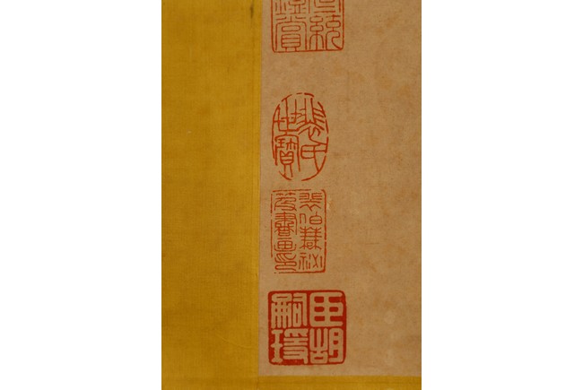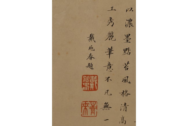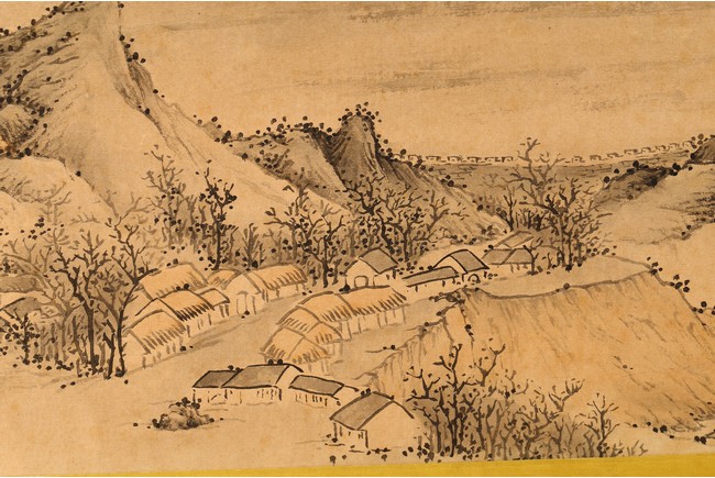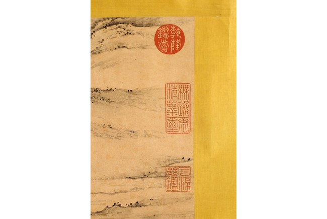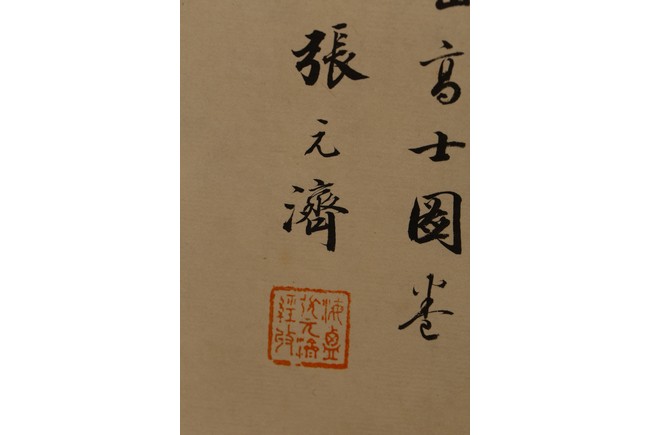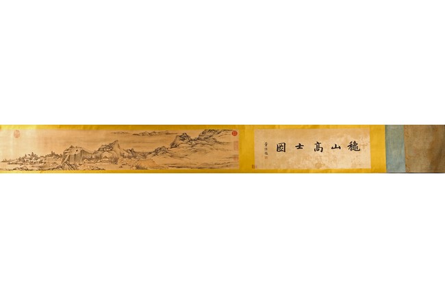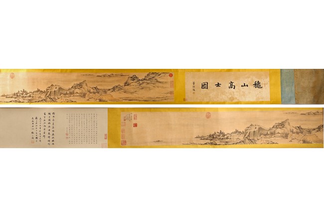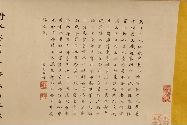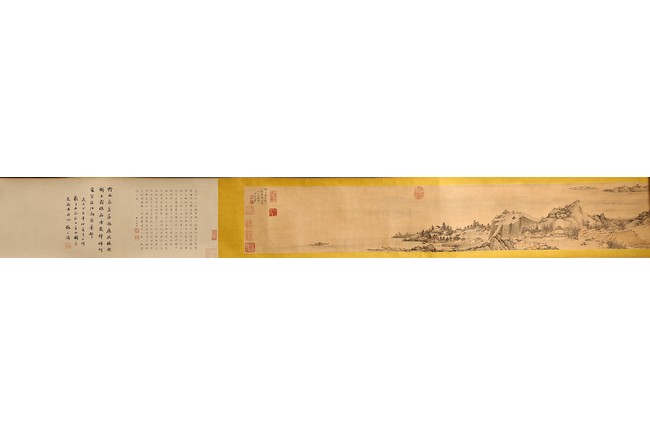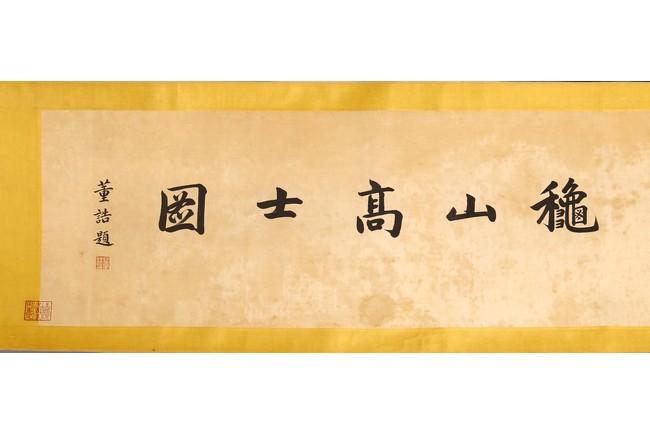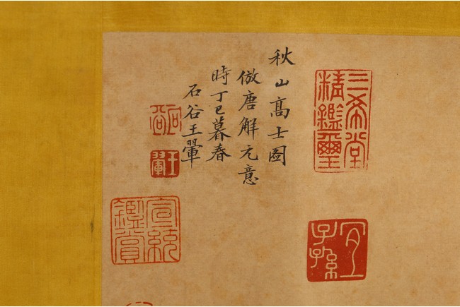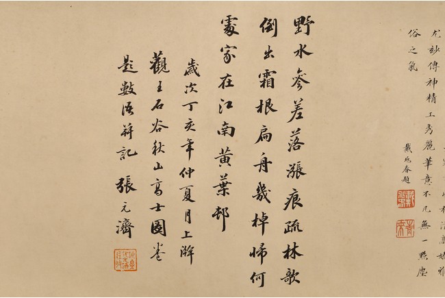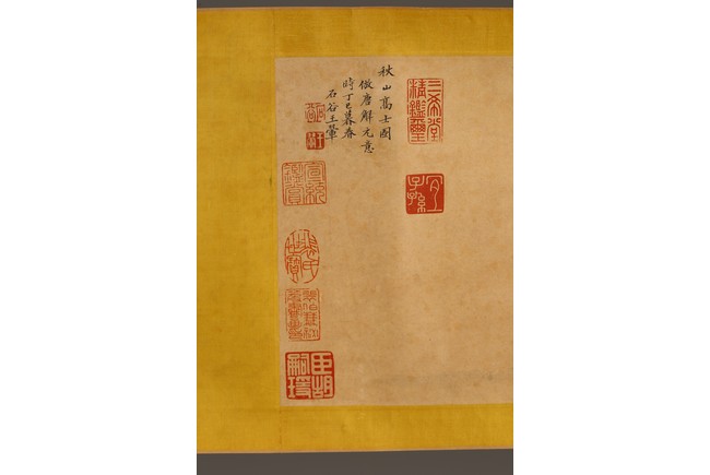 Chinese. Ink on paper. Mountain Scene in Autumn. Inscribed and signed Shigu Wang Hui, with seals of the artist and the collectors. Frontispiece calligraphy matching the theme of the painting and signed Dong Hao, two colophones by Dai Zhaochun and Zhang Yuanji with three seal marks.