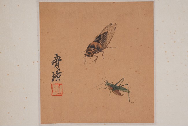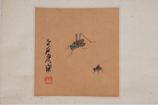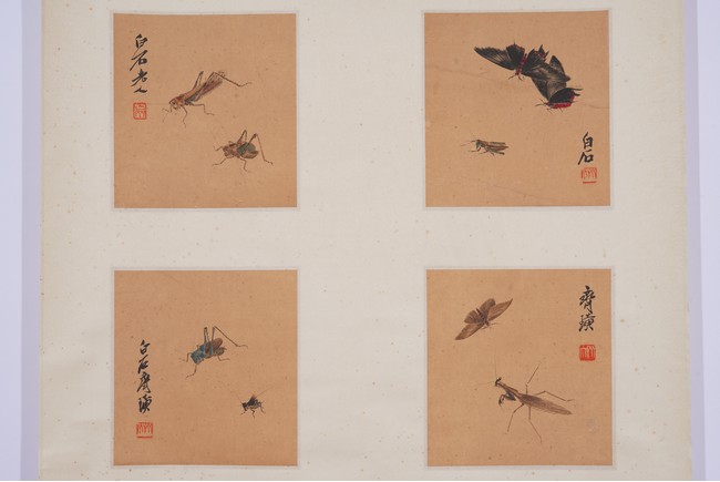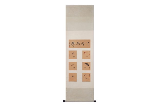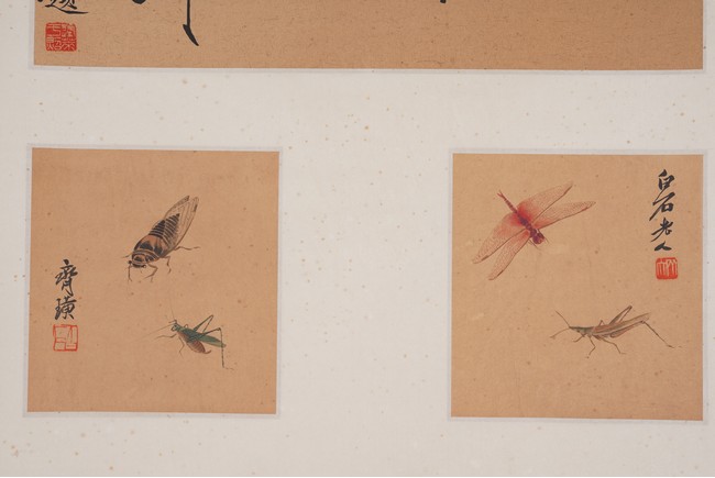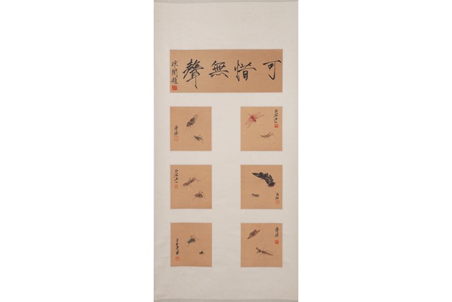 Color and ink on paper. Insects. Six paintings. Signed. Calligraphy signed Fei An. Hanging scroll.