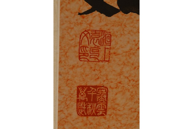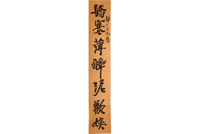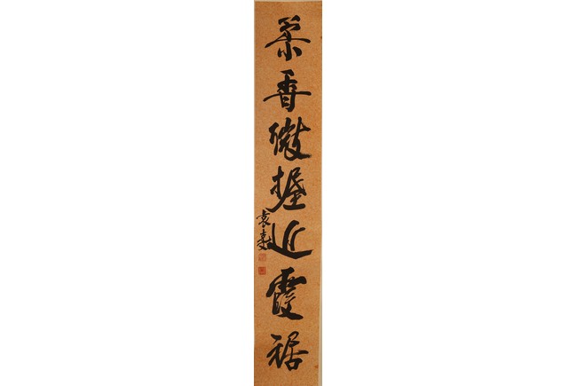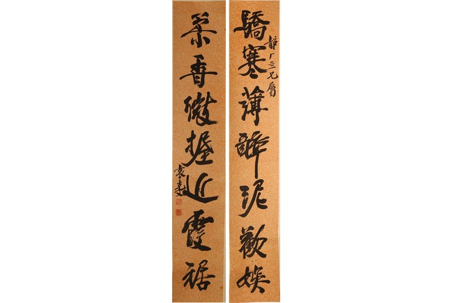 Chinese. Ink on paper. Calligraphy couplet. Mounted on paper. Signed Yuan Kewen, with dedication, with two seal marks of the artist.