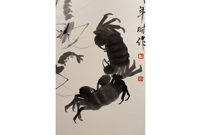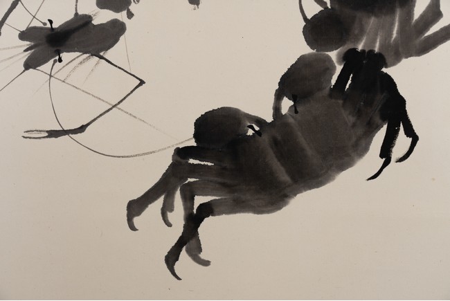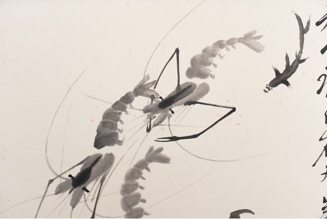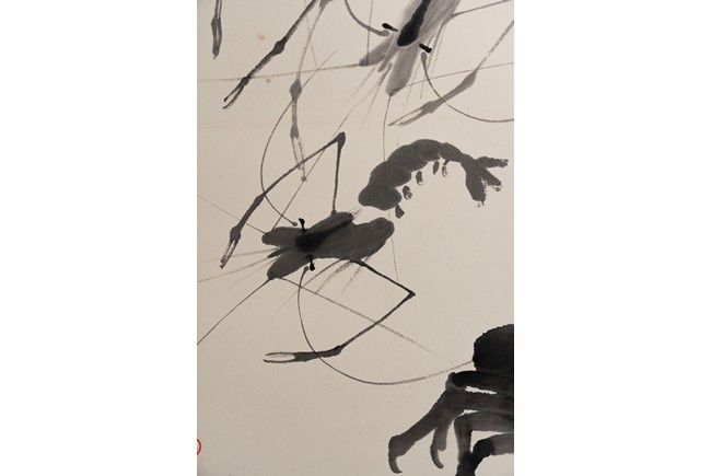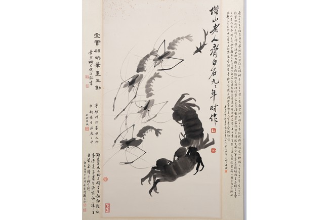 Chinese. Color and ink on paper. Shrimp and crab. Inscribed and signed Qi Baishi with four seal marks of the artist. Attributed to Qi Baishi