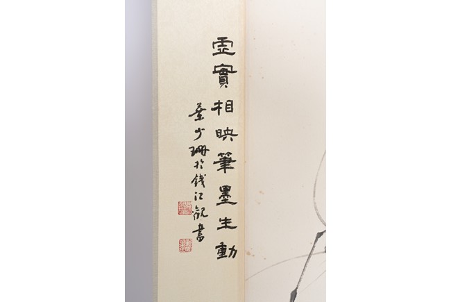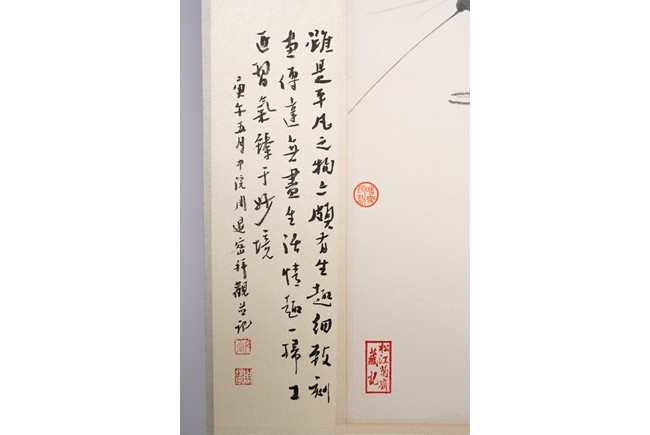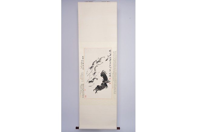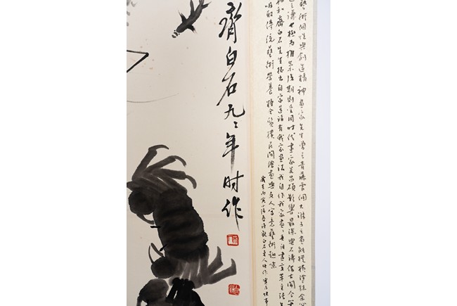 落款:借山老人齊白石九於年時作 鈴印:白石翁(齊白石:字瀕生,號白石、白石山翁、老萍、餓叟、借山吟館主者、寄萍堂上老人、三百石印富翁,近現代中國繪畫大師,世界文化名人。擅畫花鳥、蟲魚、山水、人物,筆墨雄渾滋潤,色彩濃艷明快,造型簡練生動,意境淳厚朴實。所作魚蝦蟲蟹,天趣橫生。)