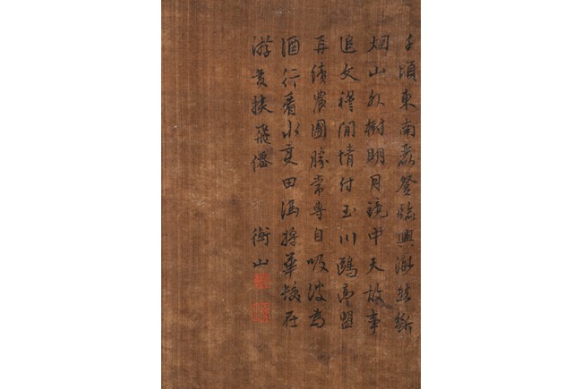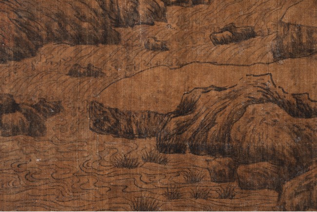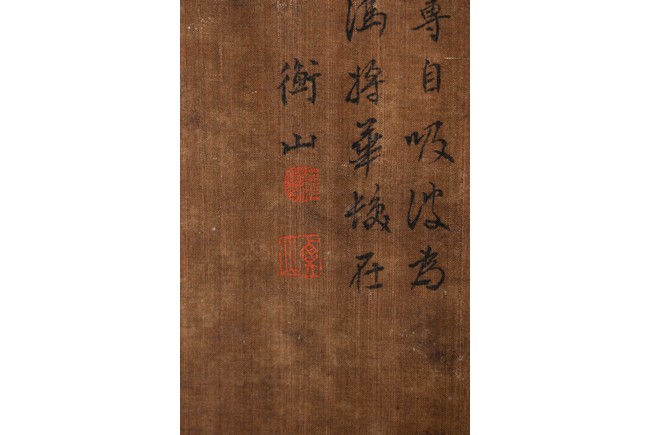 Ink on silk. landscape. Inscribed and signed Heng Shan. Hanging scroll