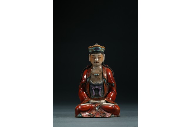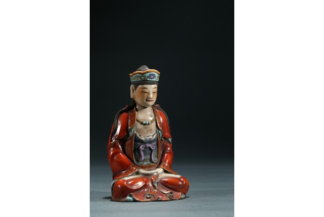The well modelled ceramic figure is shown seated with hands held together rested upon feet, wearing red-glazed long robe revealing chest, face with serene expression.
