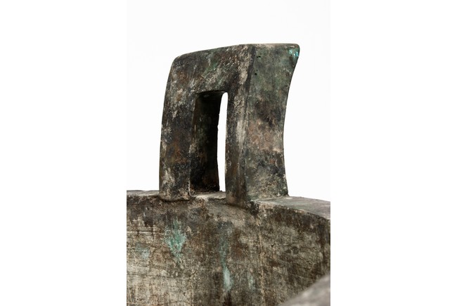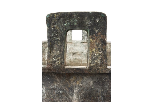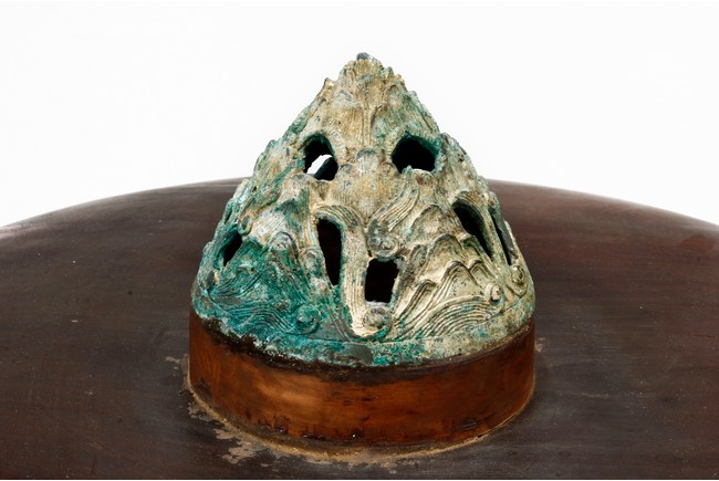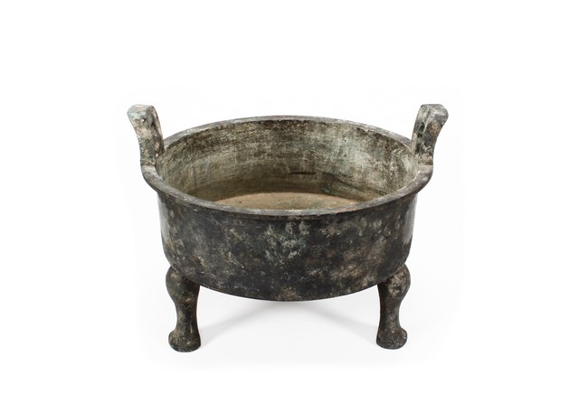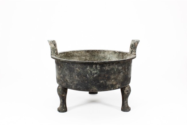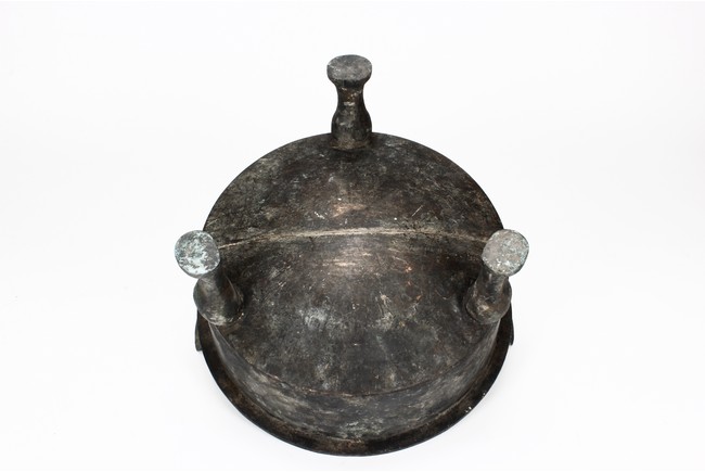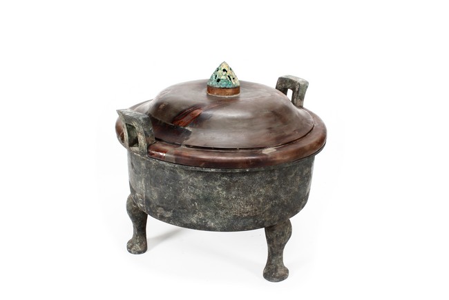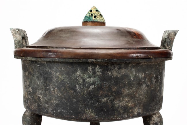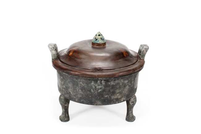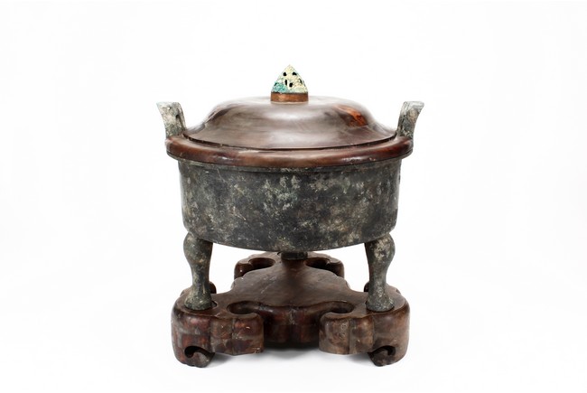 The large compressed columnar body is raised on three slender legs, two upright handles raised above the sides, casted with delicate patterns, the wooden lid is fitted with an archaic bronze finial with ocean wave patterns, all stands on a wooden stand.