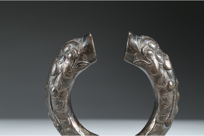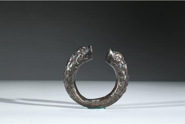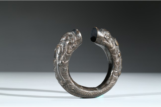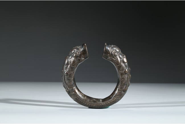 Modelled as an opened circular bangle with two dragon heads at both ends. Qing Dynasty period.