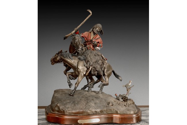 A cast bronze statue group consisting of a hunter on his back and another horse carrying the goods. It is completed with a wood base, which bears a plaque signifying the artist name Gerry Metz, and title of the sculpture as 'Troublesome Covey'.