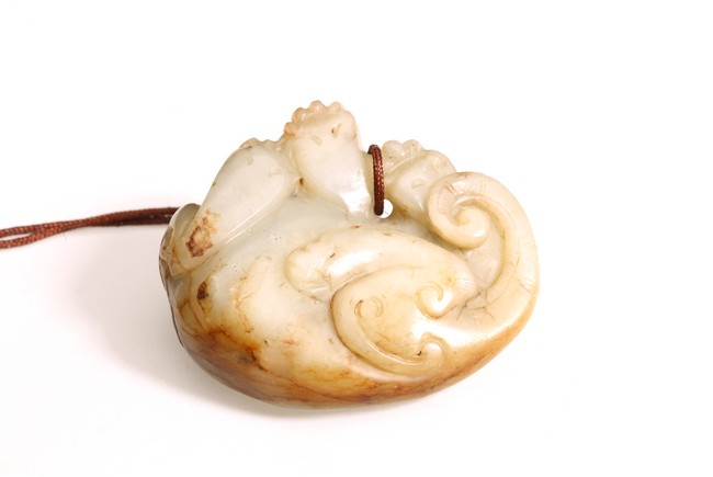 The carving is of trapezoid shaped, with two drilled holes, the stone is of white tone with russet inclusion and veins. Ming Dynasty period.