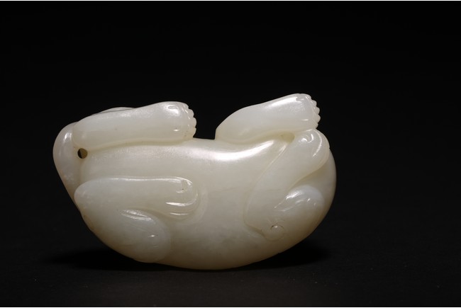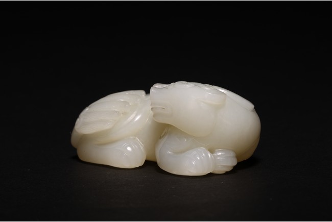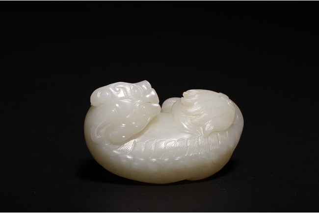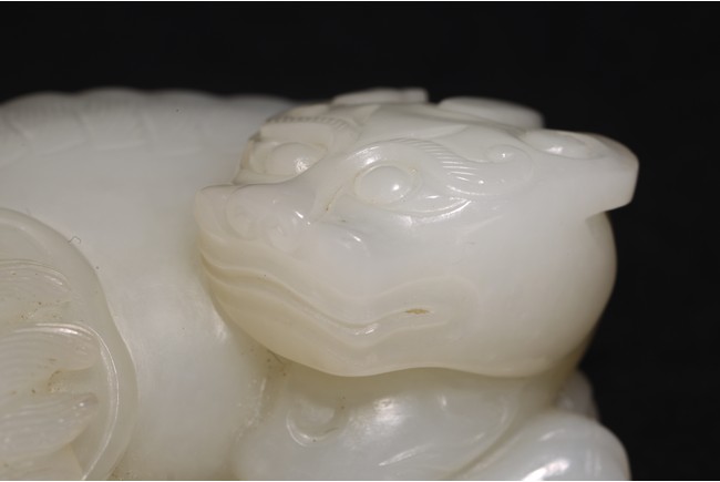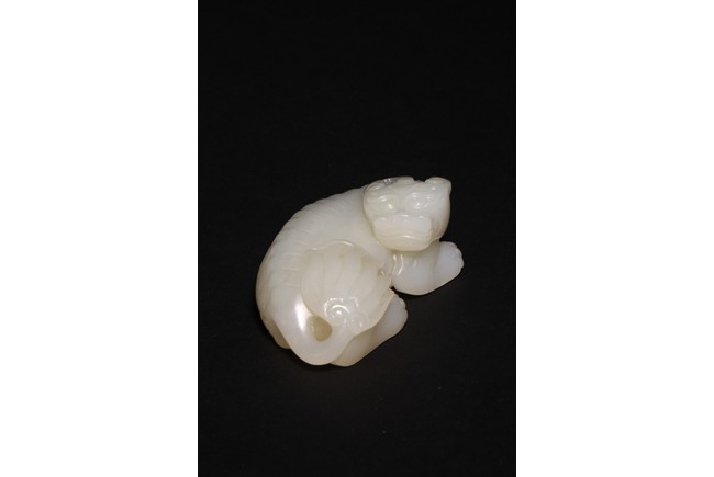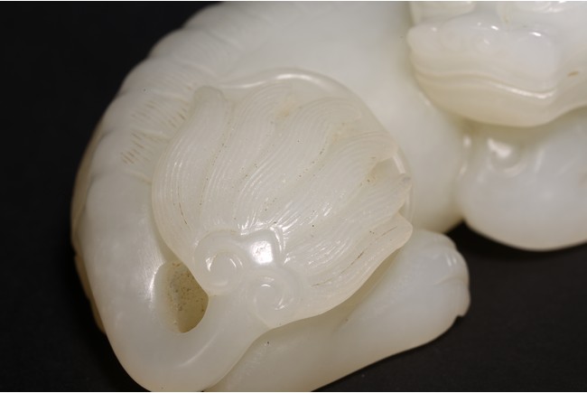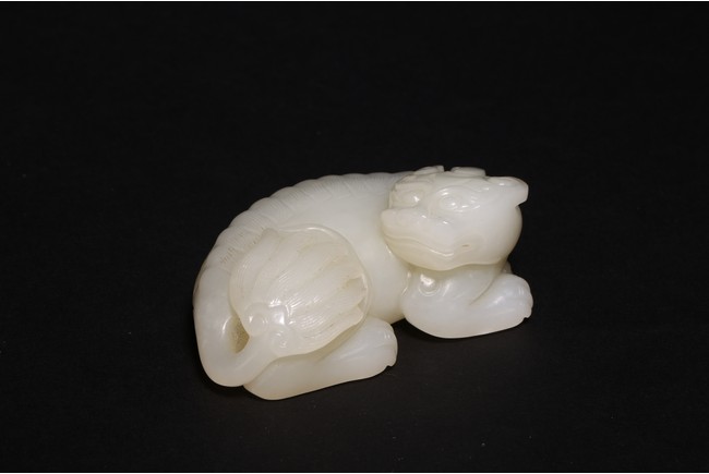 Recumbent with legs tucked underneath its body and bushy tail curled alongside its rear haunches, its head turned backward detailed with a pair of almond-shaped eyes, the stone of an even 'mutton-fat' white tone. Qing Dynasty period.