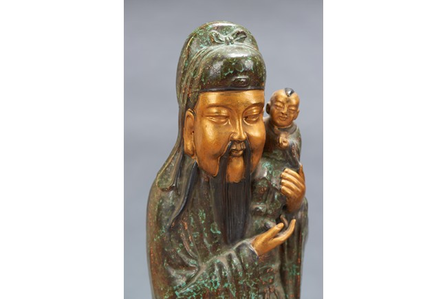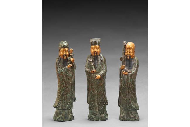 The group comprises of three large glazed immortal figures, fu, lu, and shou, each representing prosperity, status and longevity, each wearing long robe with elegant folds, glazed with flecks of blue, the face richly painted in gilt, the underside impressed with four character mark 'Fujian Hui Guan' which may be translated as Hokkien Association. Republic period.