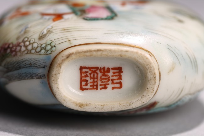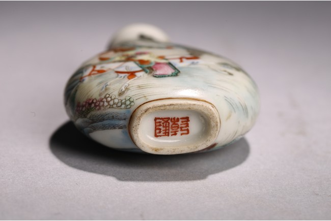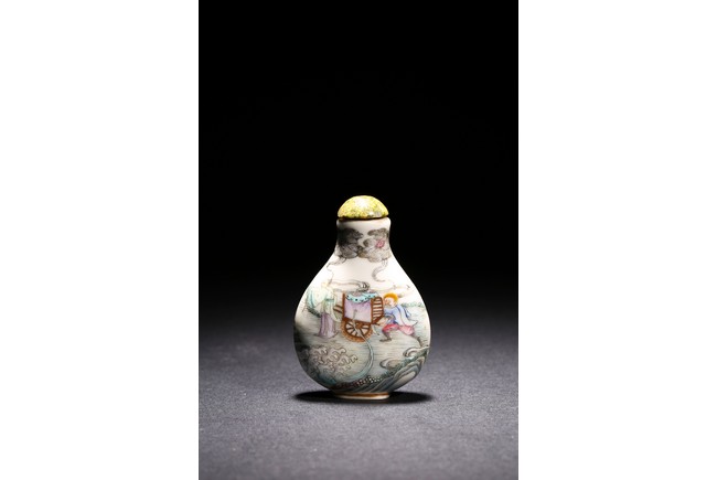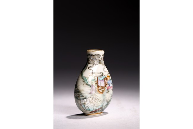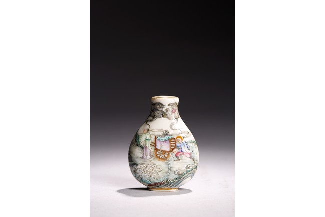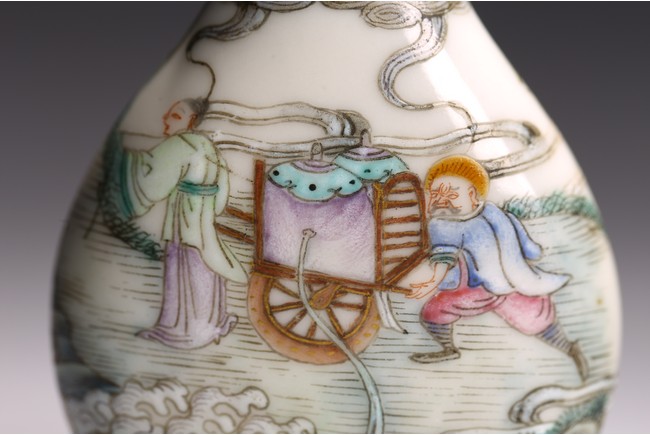 Of pear shape rising from a short foot to a waisted neck, the body elaborately enamelled in great details in famille-rose to depict a warrior on horse on one side and a foreigner figure pushing trolley behind a man, with dragon emerging from clouds above and turbulent ocean waves below, base with Qianlong mark. Qing Dynasty Qianlong period.
