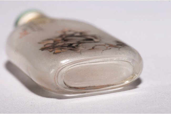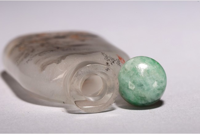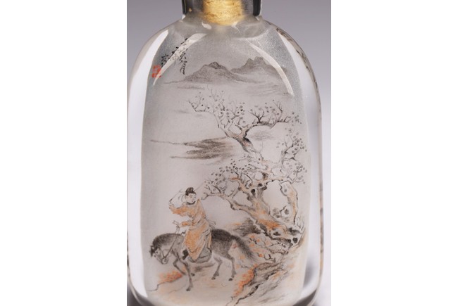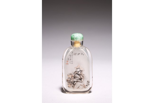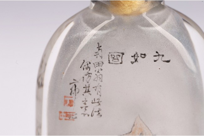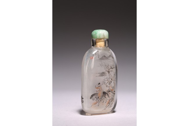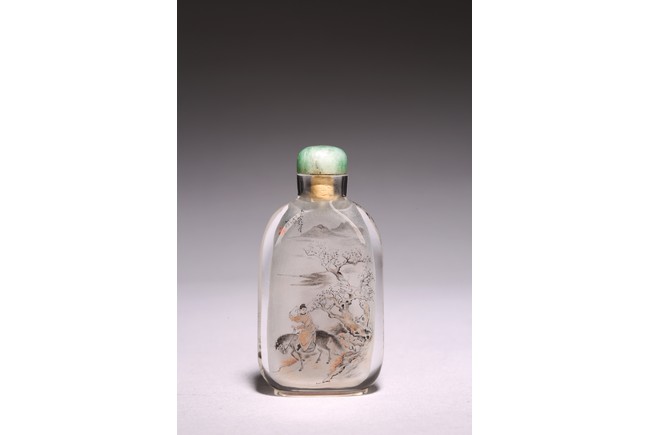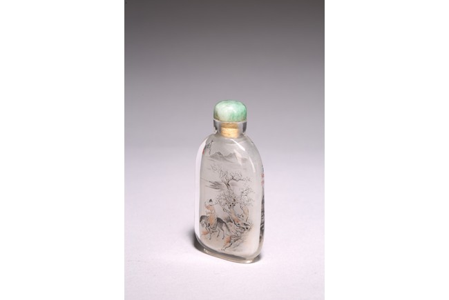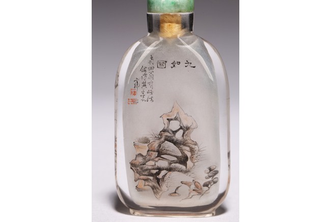 Chinese. Dated to August 1902. Ding Erzhong (1868 - 1935). The glass inside painted snuff bottle finely on the front side with chinese scholar rock and plants, inscribed above with three characters 'Jiu Ru Tu' and inscription attributed to Nan Tian and signed Erzhong, with two seal marks of the artist; the reverse further painted with a figure on horse turned backward, next to a large tree, with mountains in far background, dated to 1902 august according to inscription on top left. Fitted with jadeite stopper.