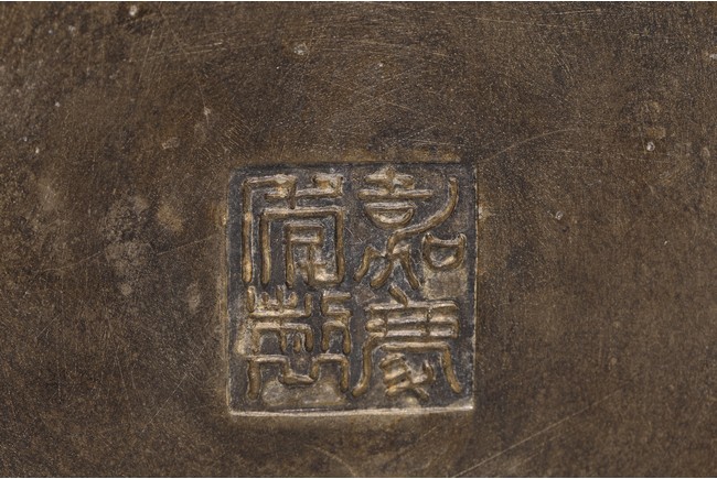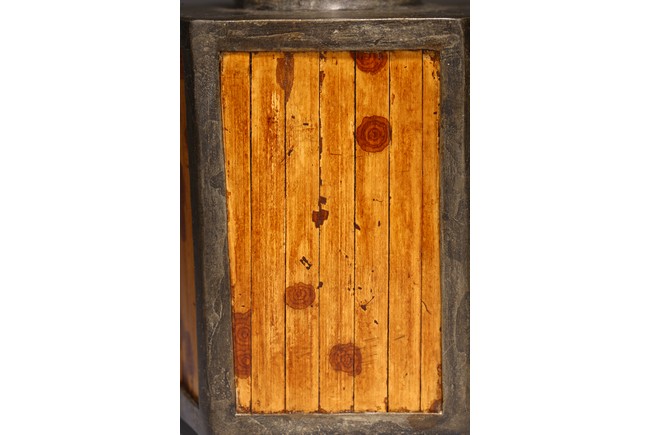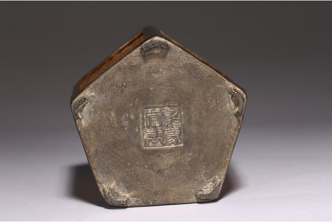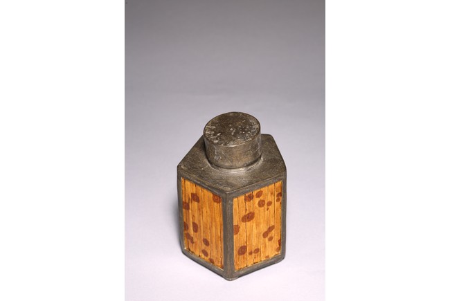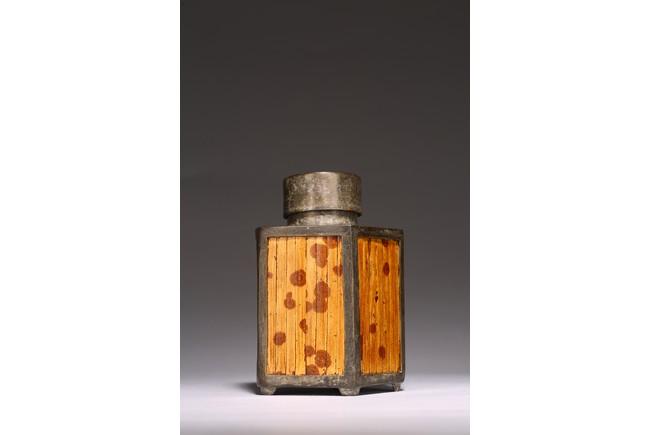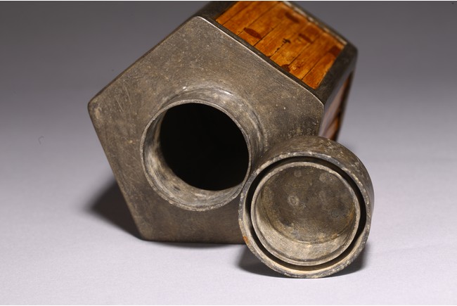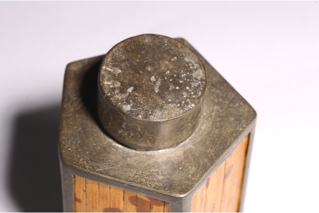 Chinese. Of hexagonal form, the six sided body embellished with vertical bamboo strips, the base inscribed with four character mark, cylindrical cap. Late Qing Dynasty period.
