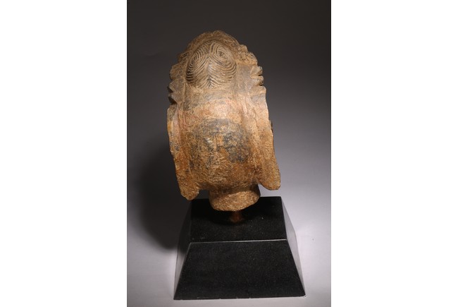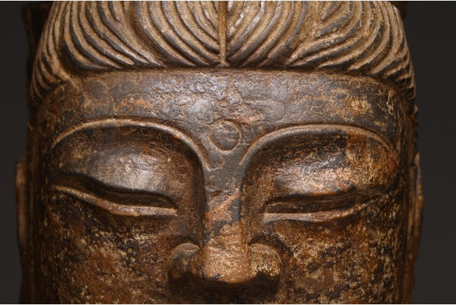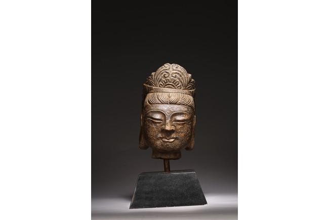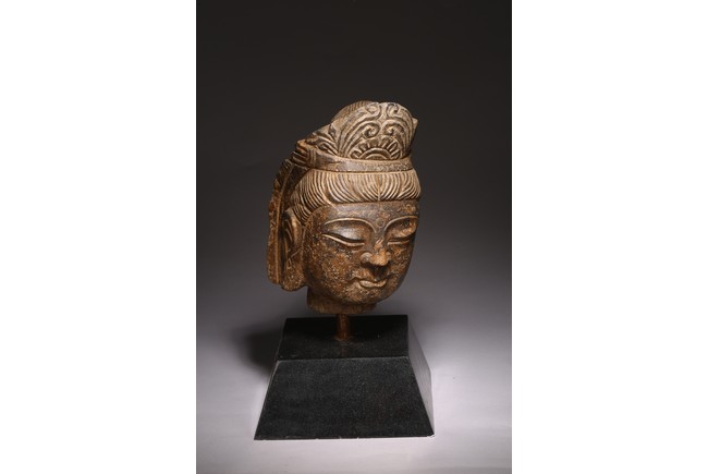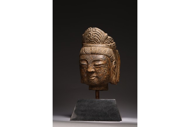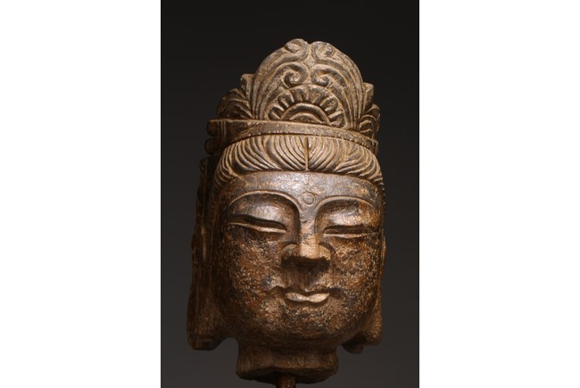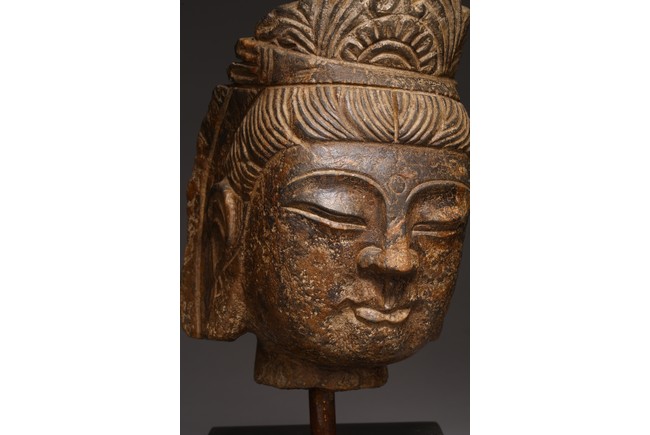 The face carved with a serene expression, the downcast eyes set beneath arched eyebrows leading to the straight nose above full lips, the rounded cheeks framed by pendulous earlobes and surmounted by an elaborate diadem concealing chignon. Sui/Tang Dynasty period.