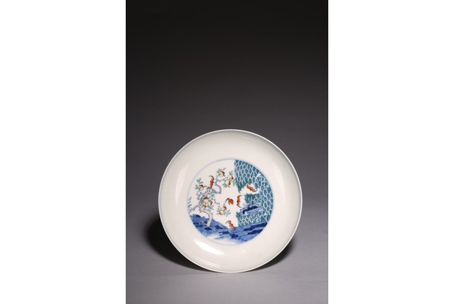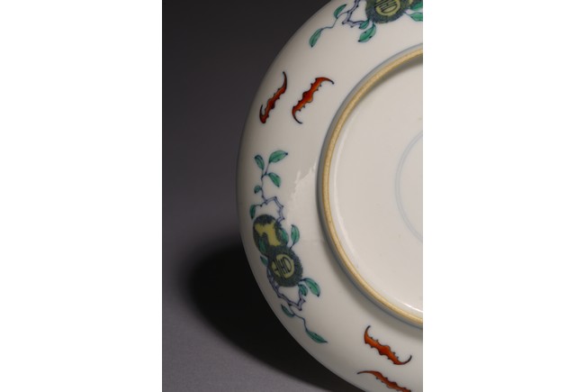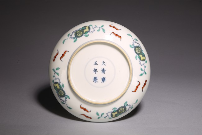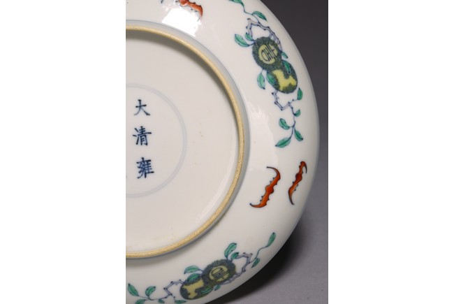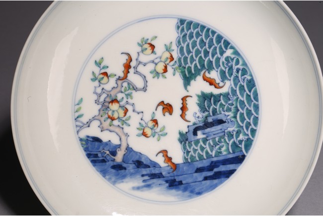 The shallow rounded sides rising from a tapered foot, decorated in the center with five bats flying around peach tree, above a green sea with crested waves, the exterior with four fruiting sprigs each enclosing a stylised shou character alternating with pairs of confronting bats, inscribed to the base with a six-character reign mark. Qing Dynasty period.