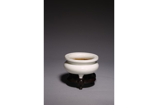 Of compressed globular form, supported on three short tapering feet, overall covered with white glaze, rosewood stand. Qing Dynasty period.