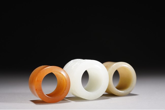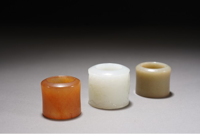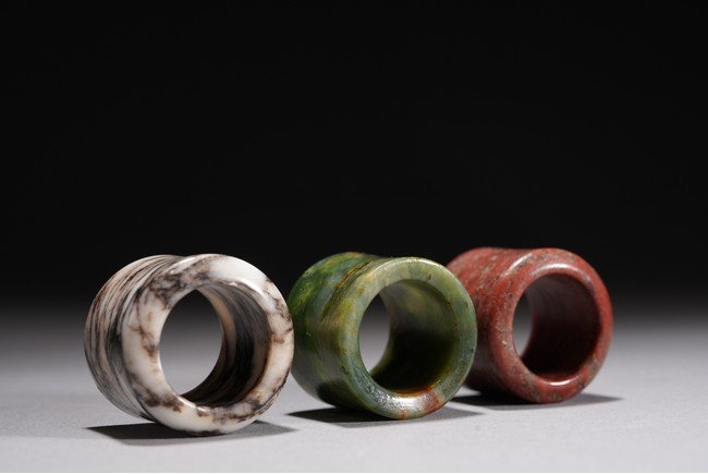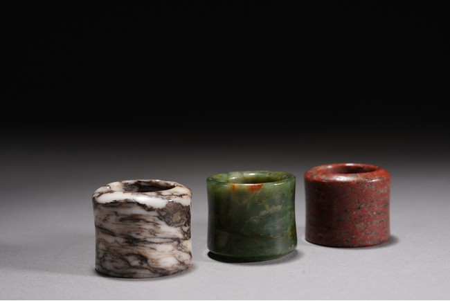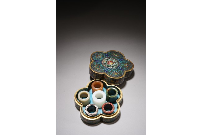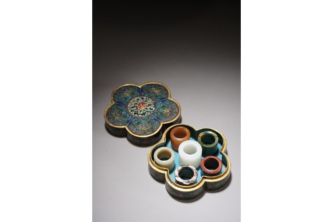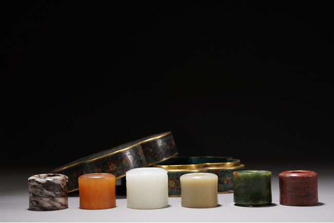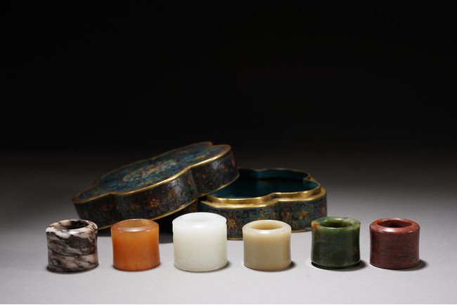 Consisting of six archer's rings of various materials, including white jade, agate, green jade, celadon jade, soapstone, etc. accompanied with a lobed cloisonne enamel box.