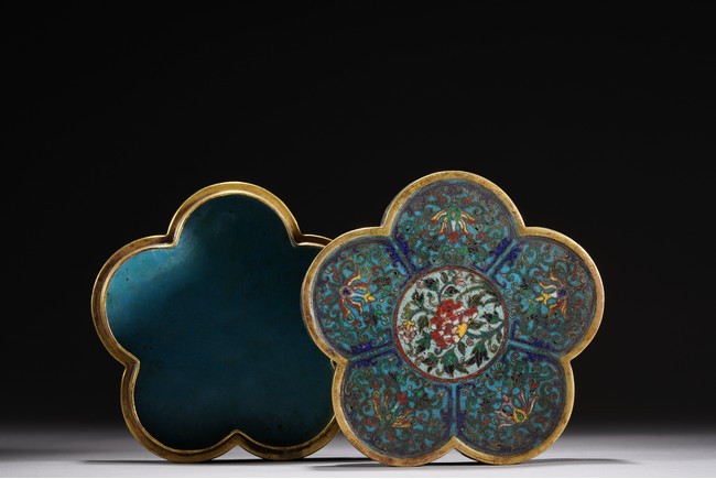 扳指一組,盒為銅胎掐絲琺瑯鎏金材質,寶相花紋飾,海棠造型,內為賞玩扳指六件,材質分別為白玉、青白玉、碧玉、瑪瑙、壽山石等珍貴材質,經過多年摩挲,包漿溫潤細膩,賞玩收藏均屬佳品。