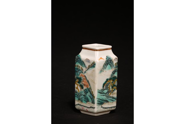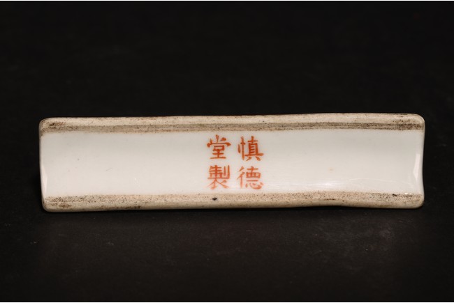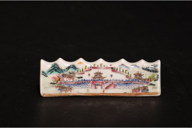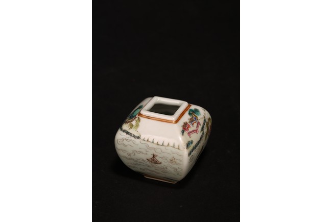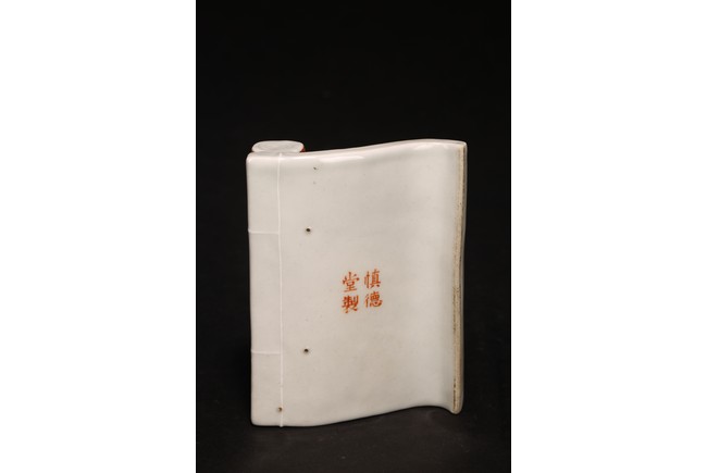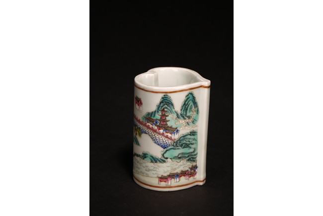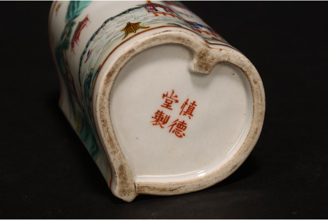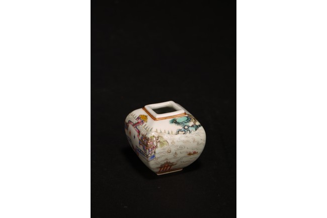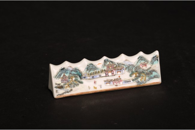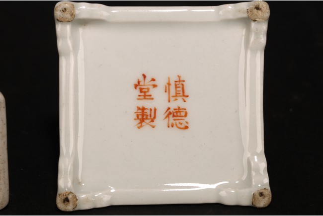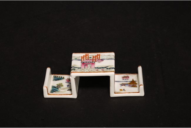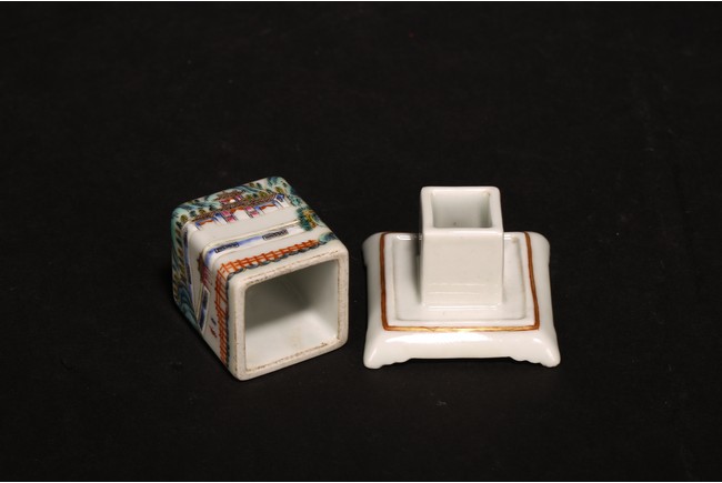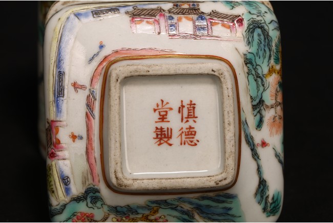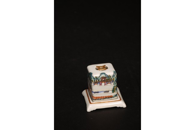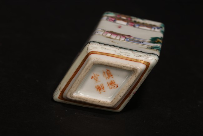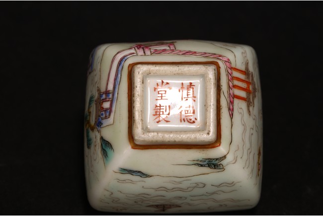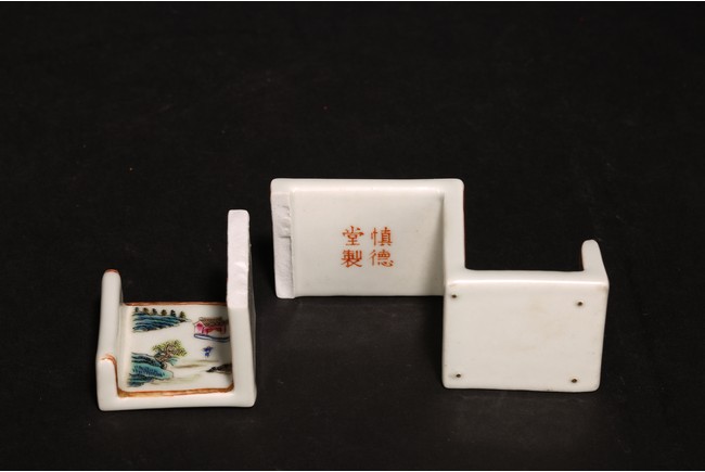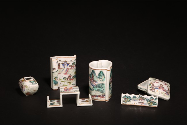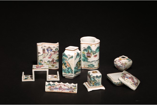 此組文房器物八件,每件均精巧可人,胎質牙白,畫工精細,粉彩典雅,主體畫面爲山水,亭臺樓閣,底款爲慎德堂制四字楷書款,保存完整,非常難得。