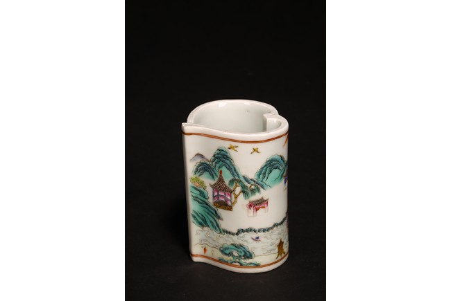Consisting of eight famille rose scholar's objects, including brushrest, water coupes, brushpots, wrist rest, with Shen De Tang mark.
