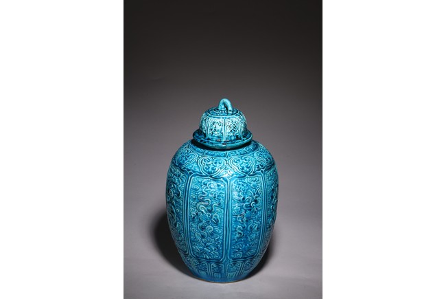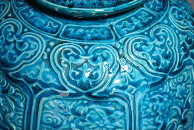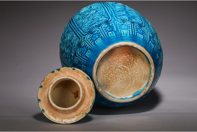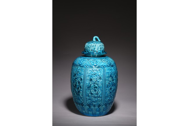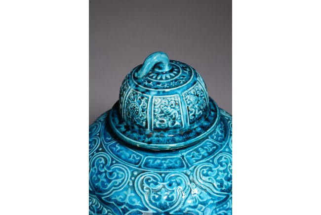 孔雀綠釉爲瓷器釉色名,亦稱「法翠釉」、「翡翠釉」、「吉翠釉」。一種以銅爲着色劑的低溫色釉,起源於宋、元民窯,最早見於宋磁州窯,盛行於元明,特別直到清初康雍幹時期,在皇帝的要求下孔雀綠釉品種,於御窯廠已達至登峯造極領域。其燒造方法有兩種:一是以素胎直接掛釉燒製,釉面易開片剝落;一是在白釉器上罩釉燒成,釉面剝落者少。形體碩大,胎骨厚重,帶蓋,子母口嚴絲合縫,直口,鼓腹漸下收,圈足。通體施孔雀綠釉,釉面瑩潤。繪「八寶紋」「如意雲紋」「捲雲紋」「蕉葉紋」等。佈局規矩,紋飾精美,構圖嚴謹