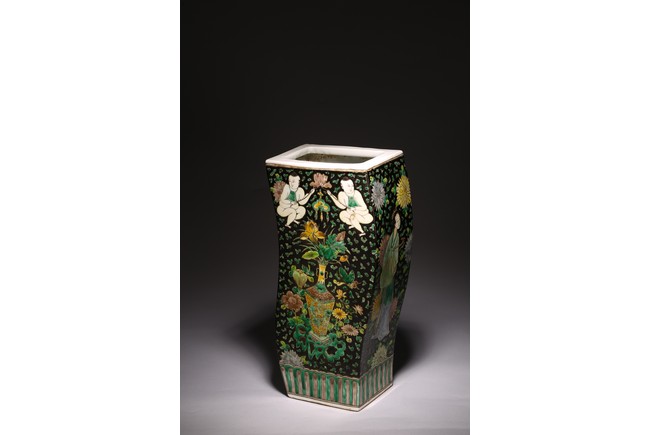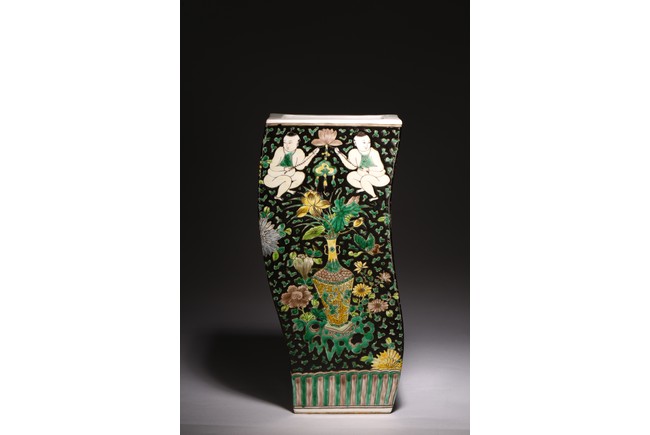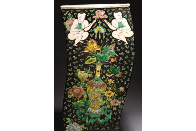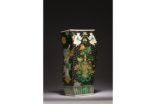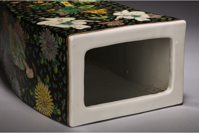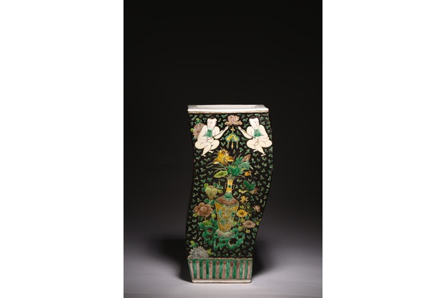 此件花插異型,古樸中帶有藝術感,四面墨地素三彩,繪持蓮童子,頑皮可愛,寓意吉祥,大面積繪博古花卉紋飾,古樸典雅,保存完整,難得花器。