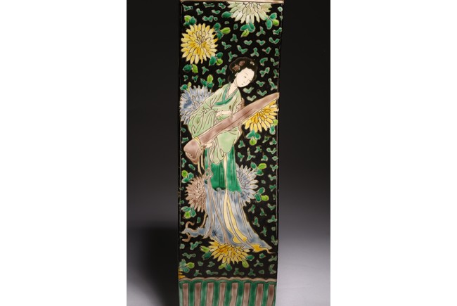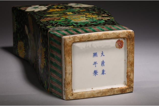 Of unusual s-shape curved form, the body decorated with boy figures, lady figure, flowering vase, etc. all reserved on black ground. The base inscribed with six character Kangxi mark.