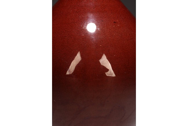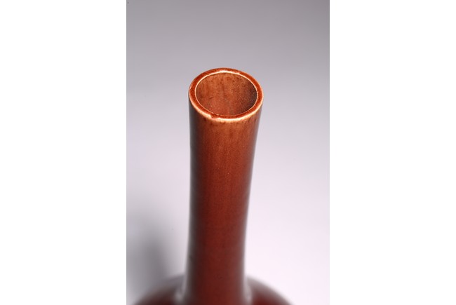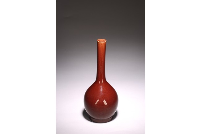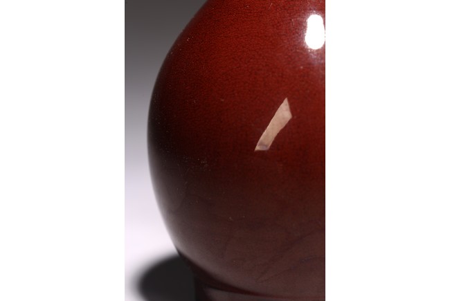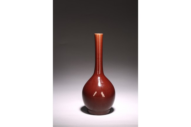 The vase of ovoid form surmounted by a tall slender neck, overall covered with deep red glaze with light crackles. Qing Dynasty period.