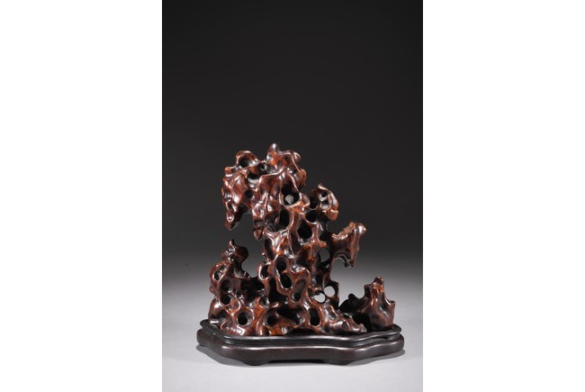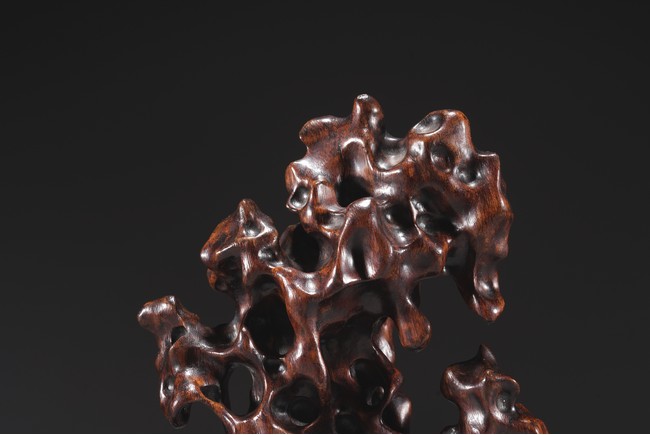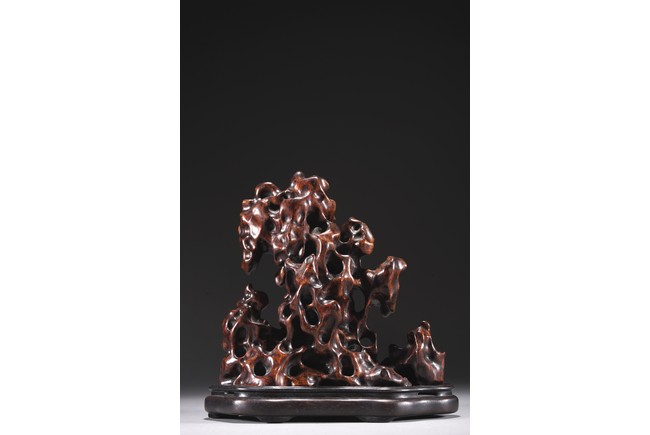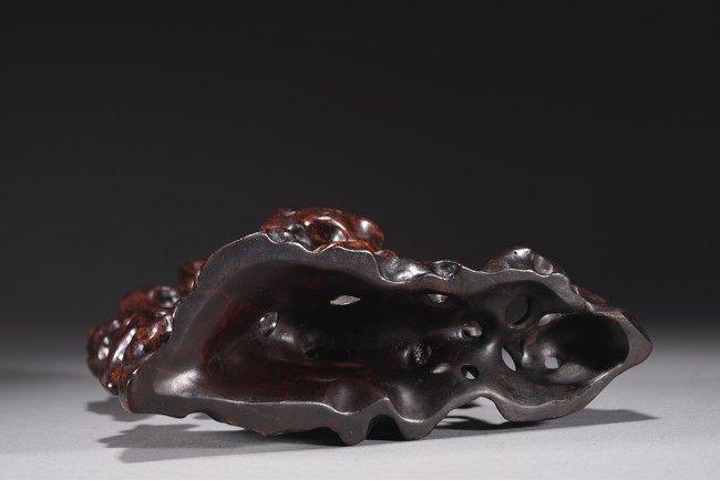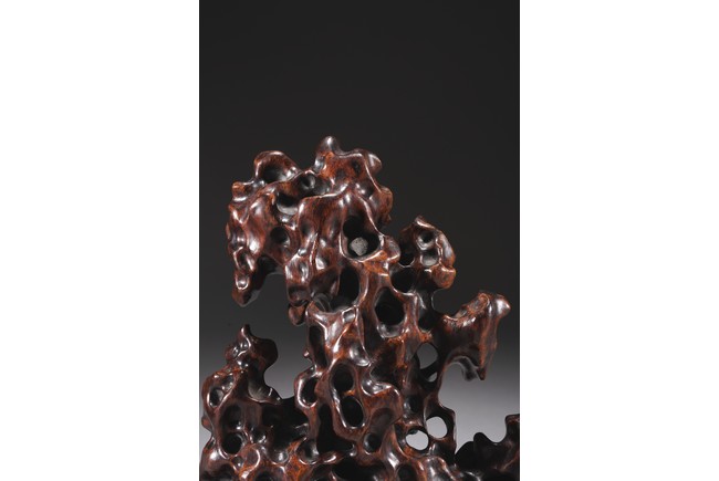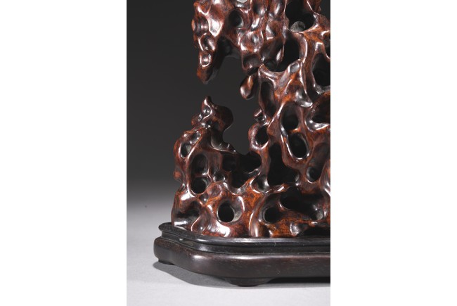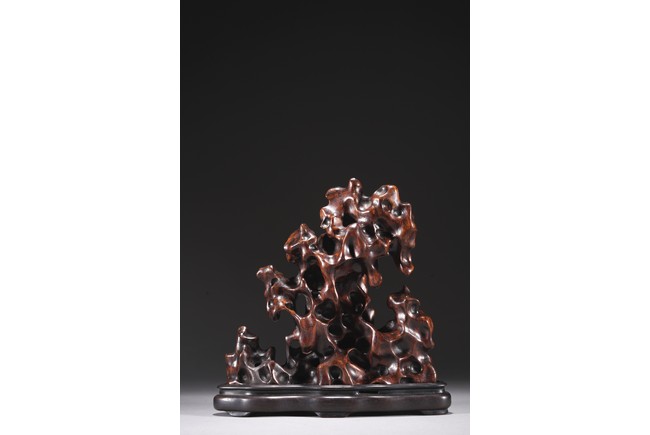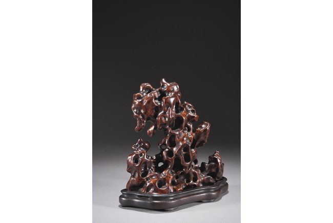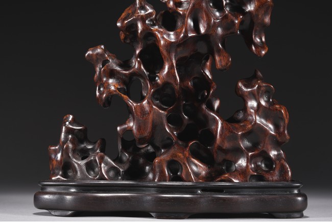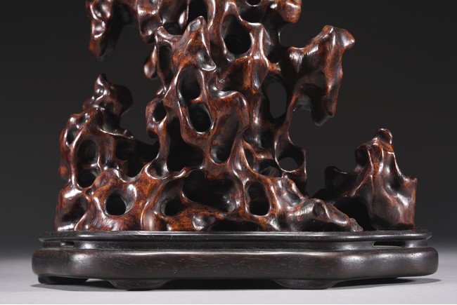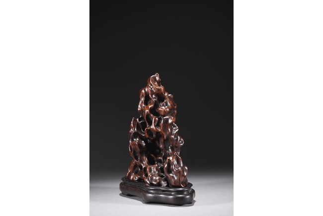 選用整塊沉香大料,隨型隨心雕琢,出山石之態,橫看成嶺側成峰,俊美異常。