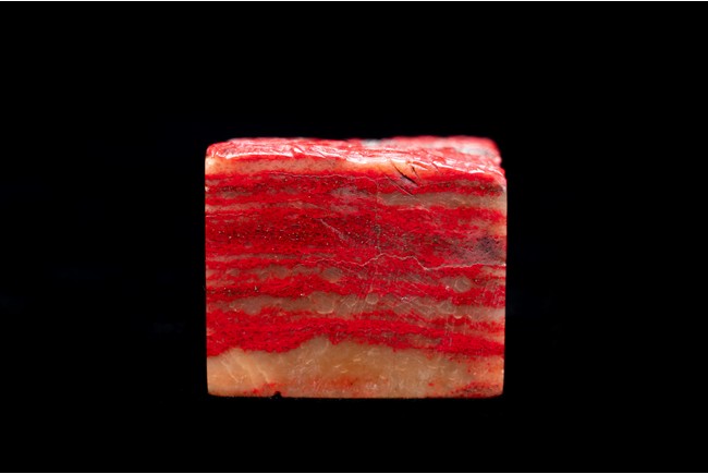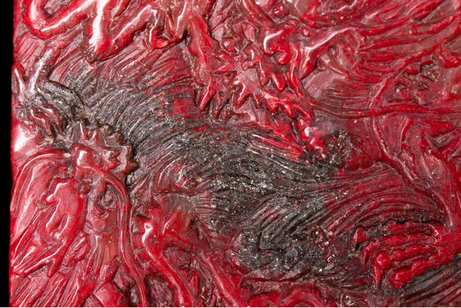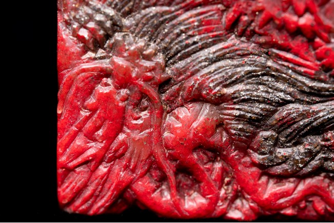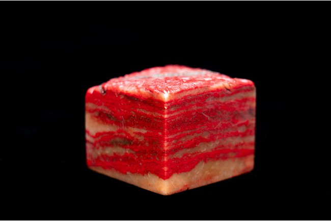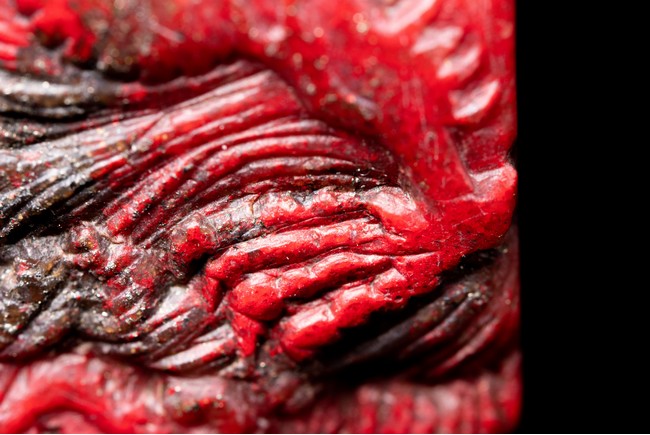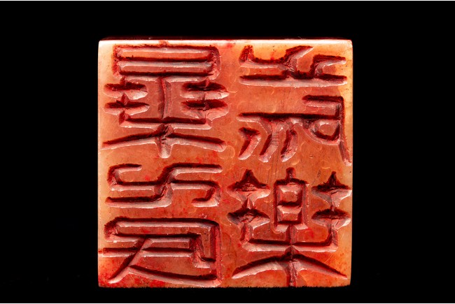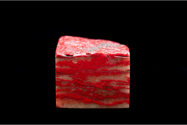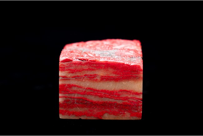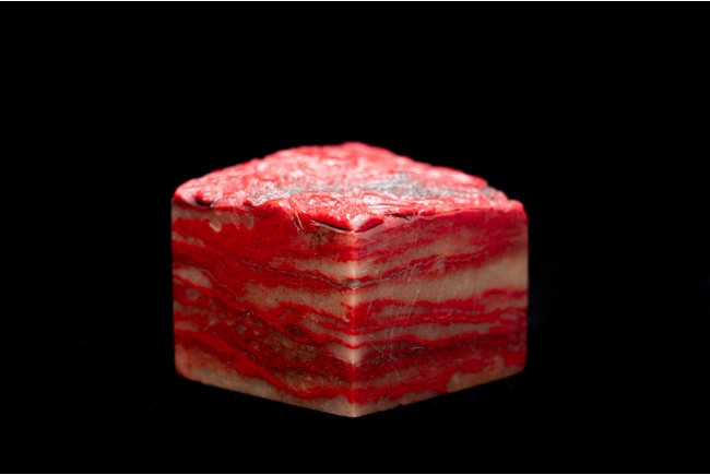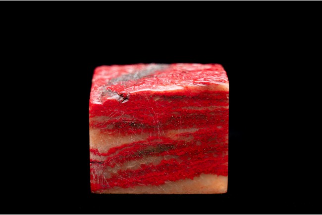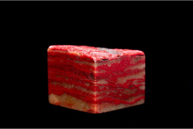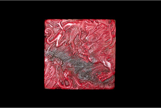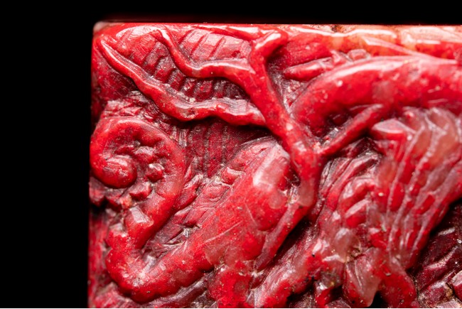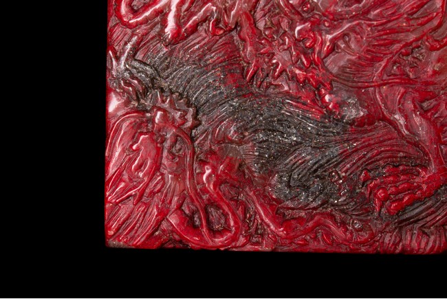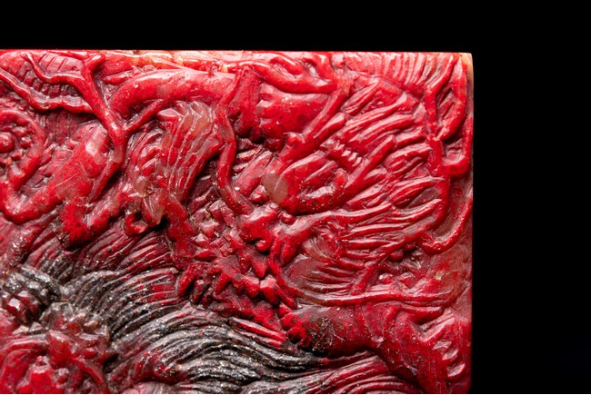 Of square form, the top carved with pair of five clawed dragons, seal face carved with four characters. The greyish-caramel tone suffused with brilliant crimson-red inclusions. Qing Dynasty period.