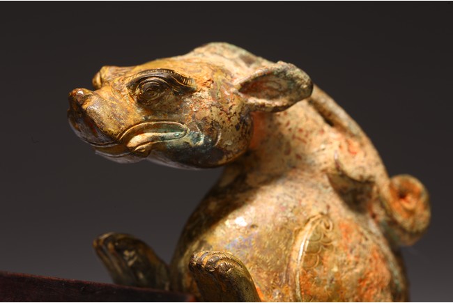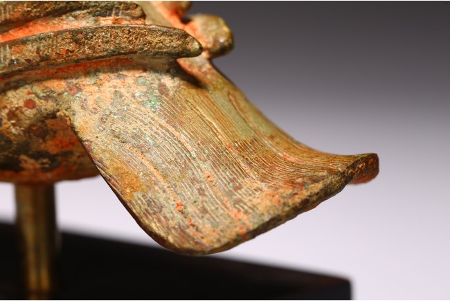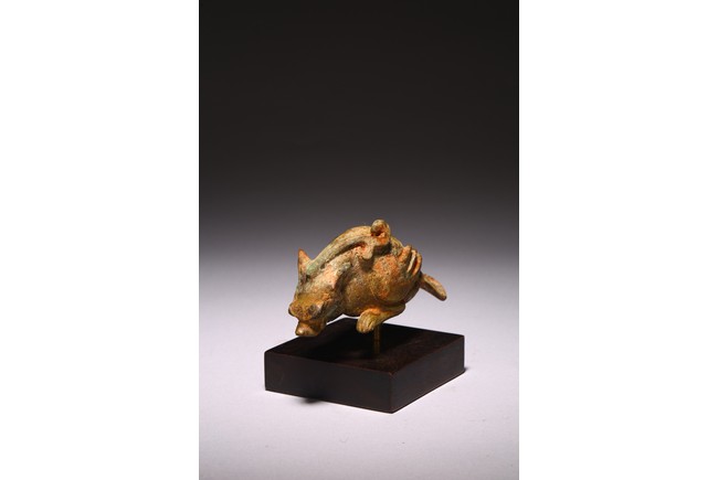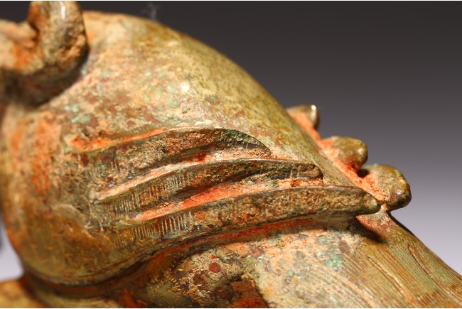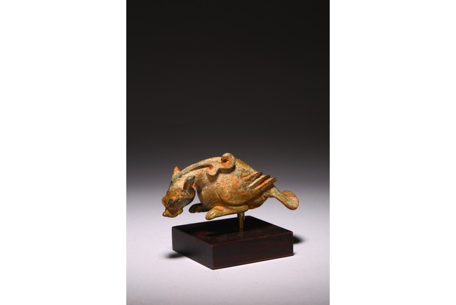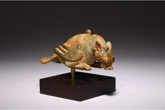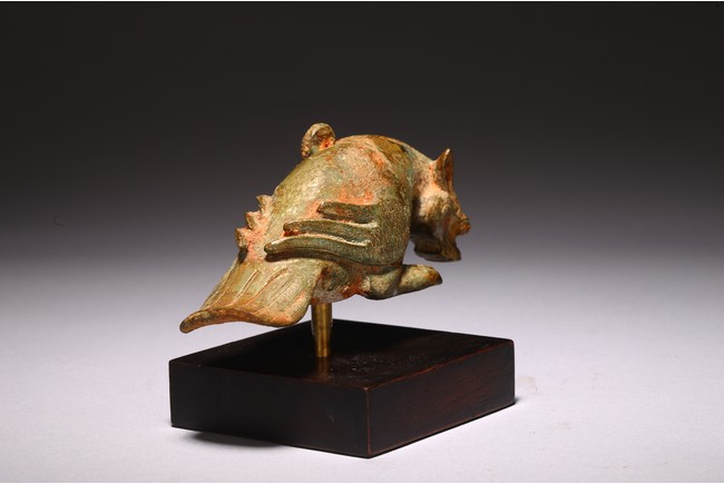 The mythical beast cast with a dragon head facing downward, the feathers on the wings and tails detailed with incised lines. Han Dynasty period.