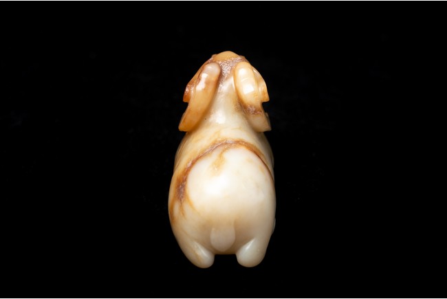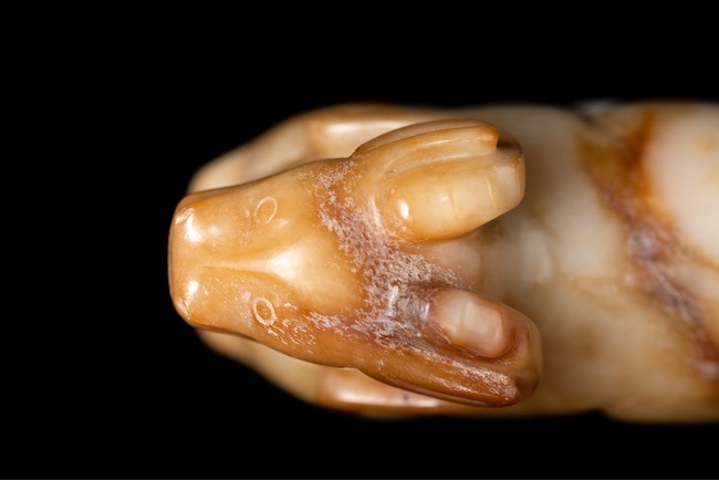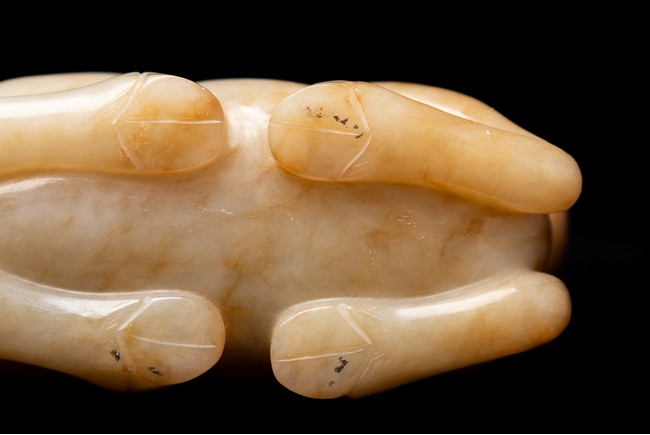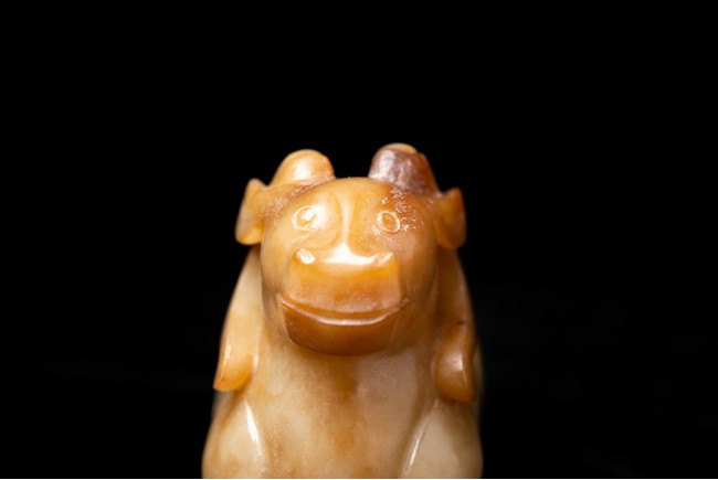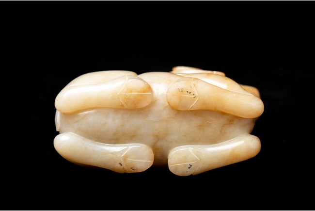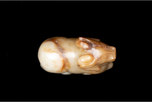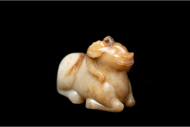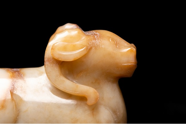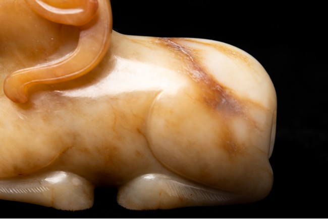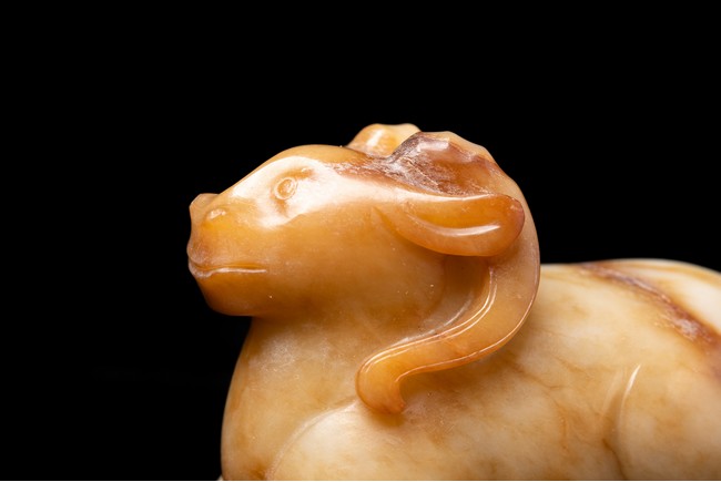 和田玉製成,玉質細膩溫潤,瑩潤光潔,包漿肥厚,局部帶有褐黃色沁色,略帶灰白沁。圓眼,大耳,闊嘴,雙角貼腦,體態豐腴,肌肉感十足。