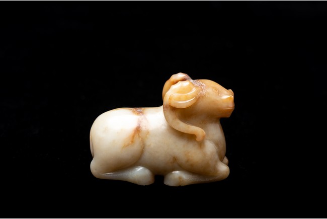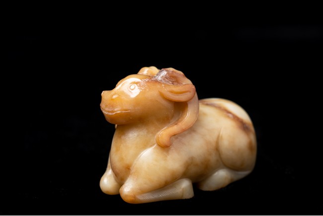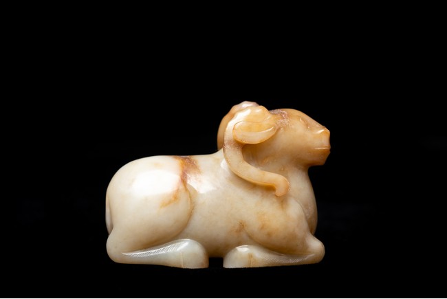 Worked recumbent with its hooves tucked beneath its body, detailed with a pair of striated horns and round eyes.