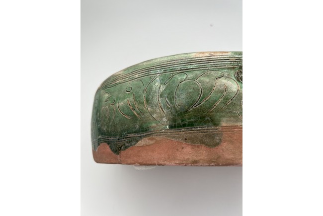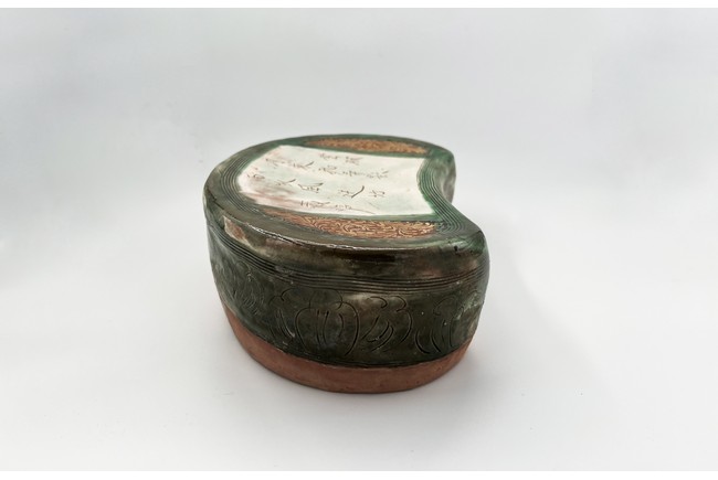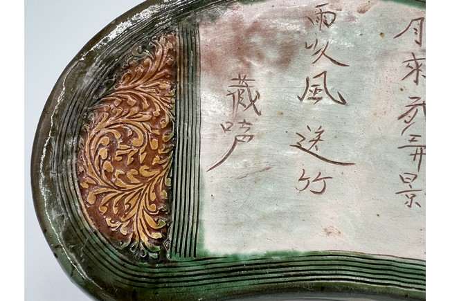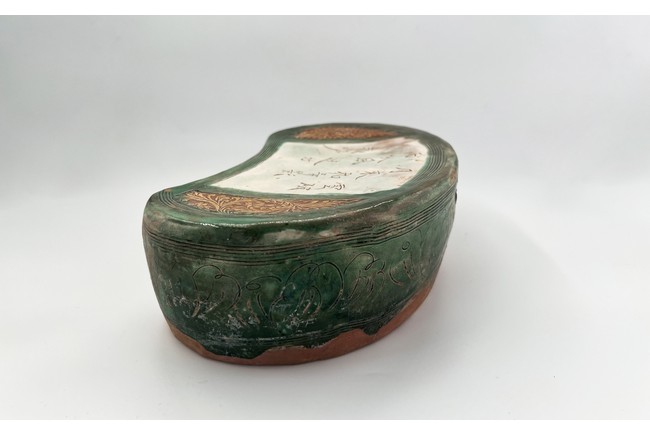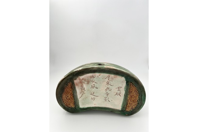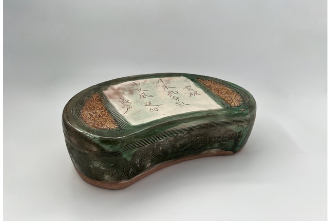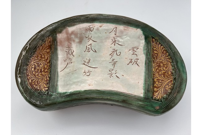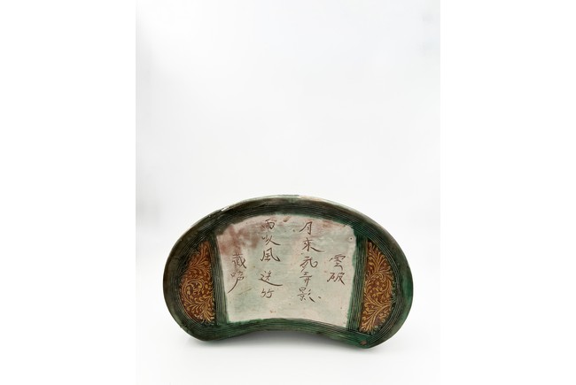 Chinese. The bean shaped pillow top incised with poem from the Northern Song poet Zhang Xian reserved on creamy-white ground, flanked by pair of floral scrolls in amber-glaze reserved on brown ground on either side, and enclosed by green-glazed outer band of multi-lines, the glaze continuing down the sides carved with a band of stylized foliage within multi-line borders and stopping unevenly above the unglazed base. Jin Dynasty period.